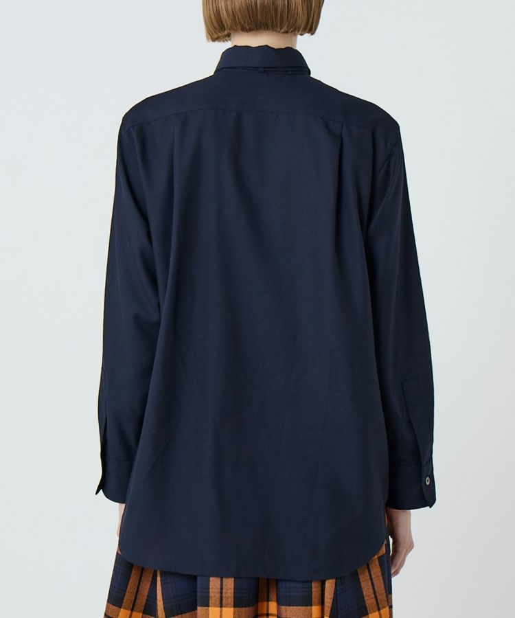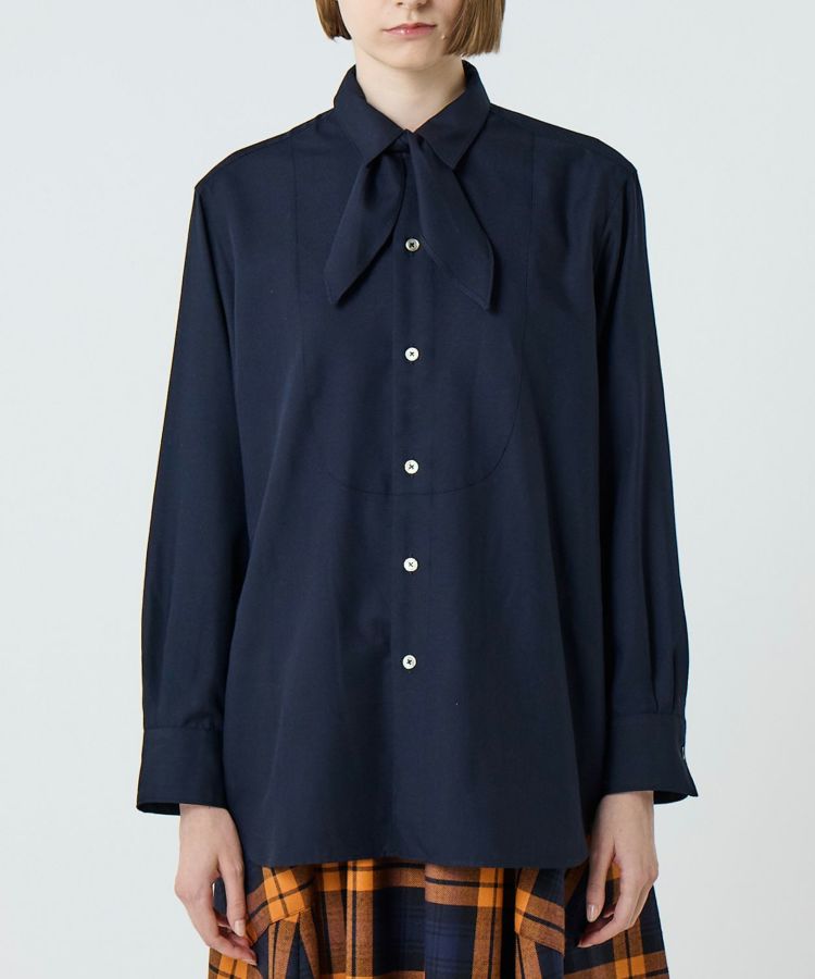胸部分に装飾(ボザム)を施したクラシカルなデザインが魅力です。UKミリタリーのマルセラシャツを元に、とろみのある素材で女性らしさと抜け感を表現。スカーフを取り外して、シンプルなシャツとしても着用可能で、ニットなどのインナーとしてもおすすめです。
