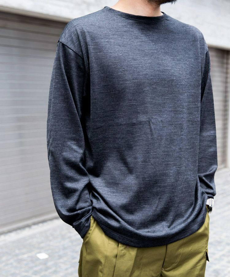 保温性、防汚性、防臭・抗菌性の高い上質なメリノウールを厳選して使用。フライスやリブをソリッドデザインにしたことで、ベースレイヤーで着用したときもアウターに響かずにきれいに着用することが可能です。ネックはリブ無しなのでカジュアルに見えすぎることもなく襟元もスッキリ。1枚で着てもソリッドなシンプルさを感じさせてくれるアイテムです。