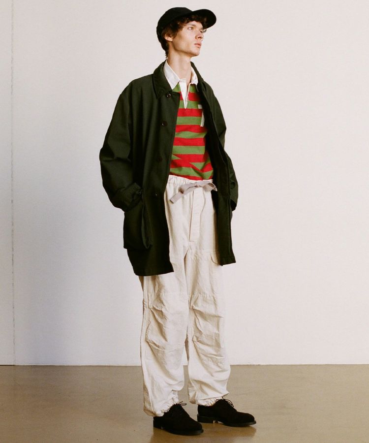 1960年代イギリスのマウンテンコートを現代的なアプローチでモディファイ。生地は60番双糸に追撚をかけて高密度で織り上げたドライタッチな生地を採用。さらに製品染めをかけることで、表面に独特なしっとりした微起毛感があり、ヴィンテージのような味わいある生地感に仕上がっています。