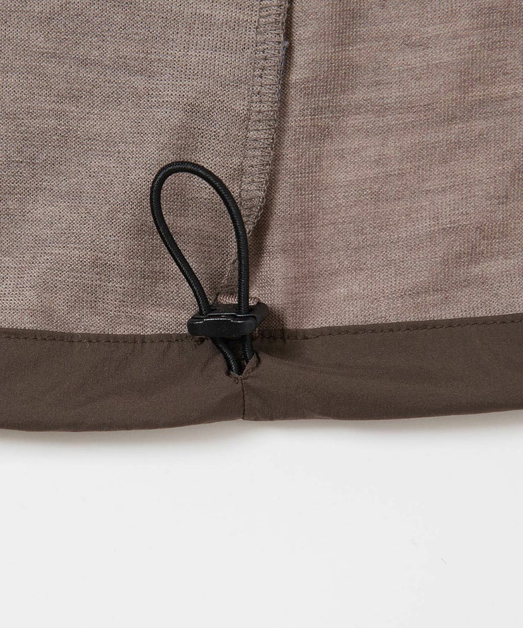 摩耗の多い肩、腰、肘には耐久性の高いナイロン生地を重ね、実用性とデザイン性を両立させています。裾に配置されたドローコードを絞ることでシルエットの変化を楽しむこともできるアイテムです。