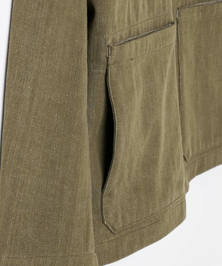 グリーンデニムは30年代から50年代頃に、イギリス軍が使用していた特徴的なデニム生地。綿の柄が入っているような粗野なムードのある生地がヴィンテージ感を漂わせます。着用による色落ちを抑えながらも1970年代のデニムをクタッとさせたような風合いが魅力です。自分の体型や動き方に合うエイジングが楽しみなアイテムです。