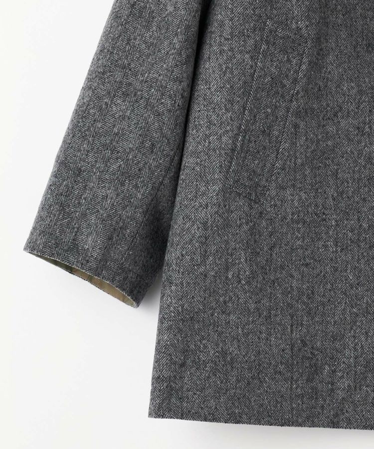 裏面には高密度に織り上げたコットンポリエステルのポプリン生地を採用。撥水加工と高い透湿性により、急な天候変化にも対応可能です。さらに、シワになりにくく摩擦に強い特性により、アクティブなランブリングシーンでも安心して着用できます。経年劣化も生じにくく、長く愛用していただけるアイテムに仕上がっています。表と裏で異なる特性を持つ生地を組み合わせることで、その日の天候やシーンに応じて使い分けられる万能なコートに仕上がっています。