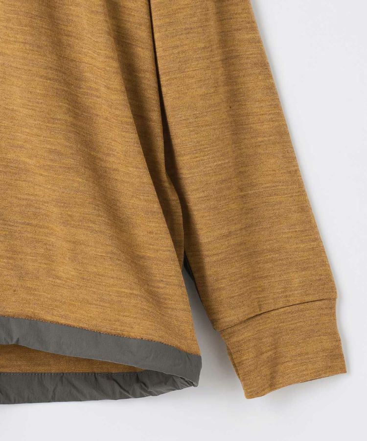 メリノウールは雑菌が付きにくく蒸れや臭いが残りにくい機能があり、体とメリノウールの間の湿度を調節してくれます。朝晩の気温変化や、冷暖房による体温調節の場面でもしっかり対応してくれる天然の高機能素材です。本アイテムでは上質なメリノウールの表面にスケールオフ加工(人間の髪に例えるとウロコのようなものを剥がす加工)を施したことで、ソフトでナチュラルタッチな風合いを出しています。このスケールオフ加工により、自宅で洗濯ができるウオッシャブルな素材に仕上がっています。