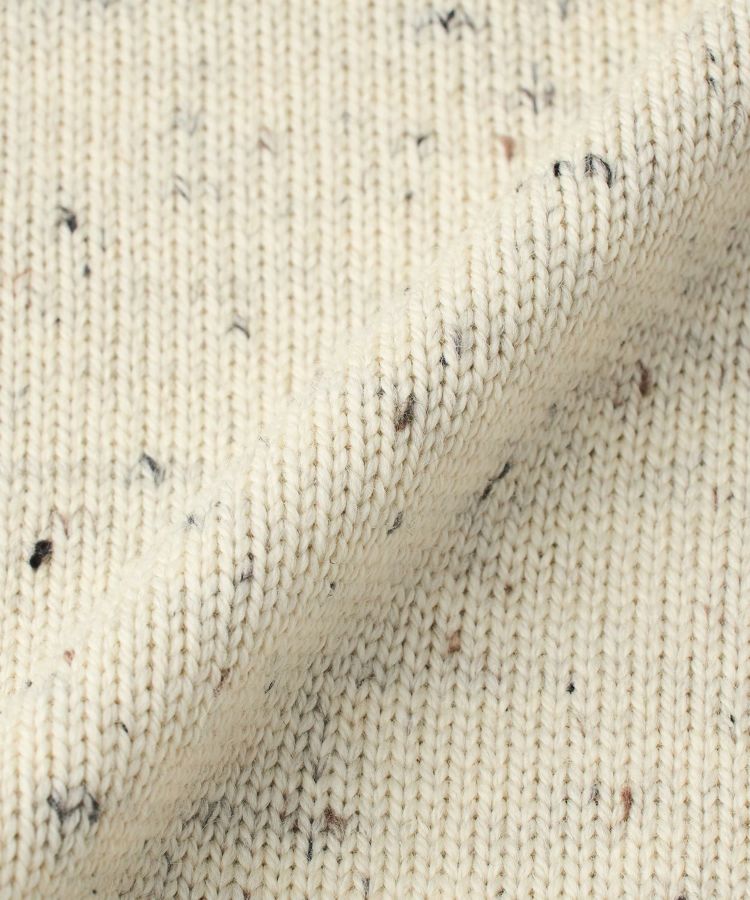 素材は日本であまり見かけない、イングランドのペナイン山脈中部に位置するShepley Yarns社の「マリオラメリノ」を使用。メリノウールの原産地であるスペインの生産者と提携して作られた糸で、虫害や病気予防のための"ミュールジング"を行わない環境に配慮した原毛を使用しています。Guernsey Woollens初のメリノウールを使用したニットアイテムです。糸にはわずかに紡績油が残されており、編み上がり後にウール用洗剤で洗い上げることで、よりふっくらとした密度のある風合いへと変化します。