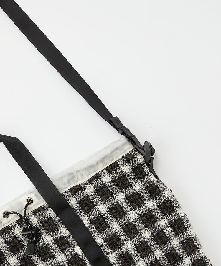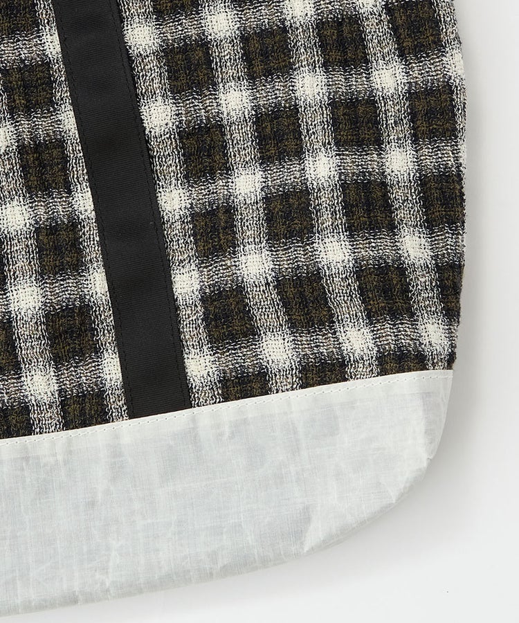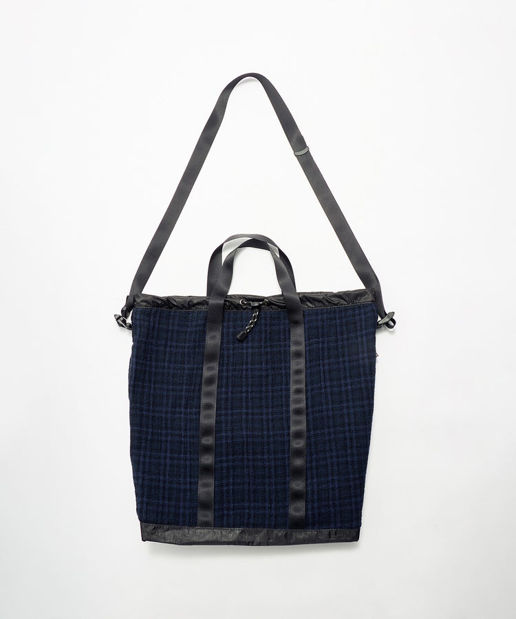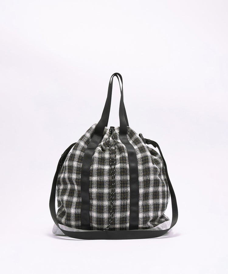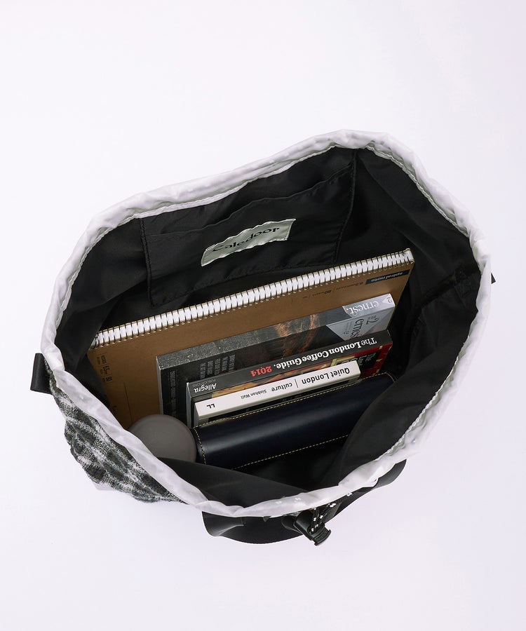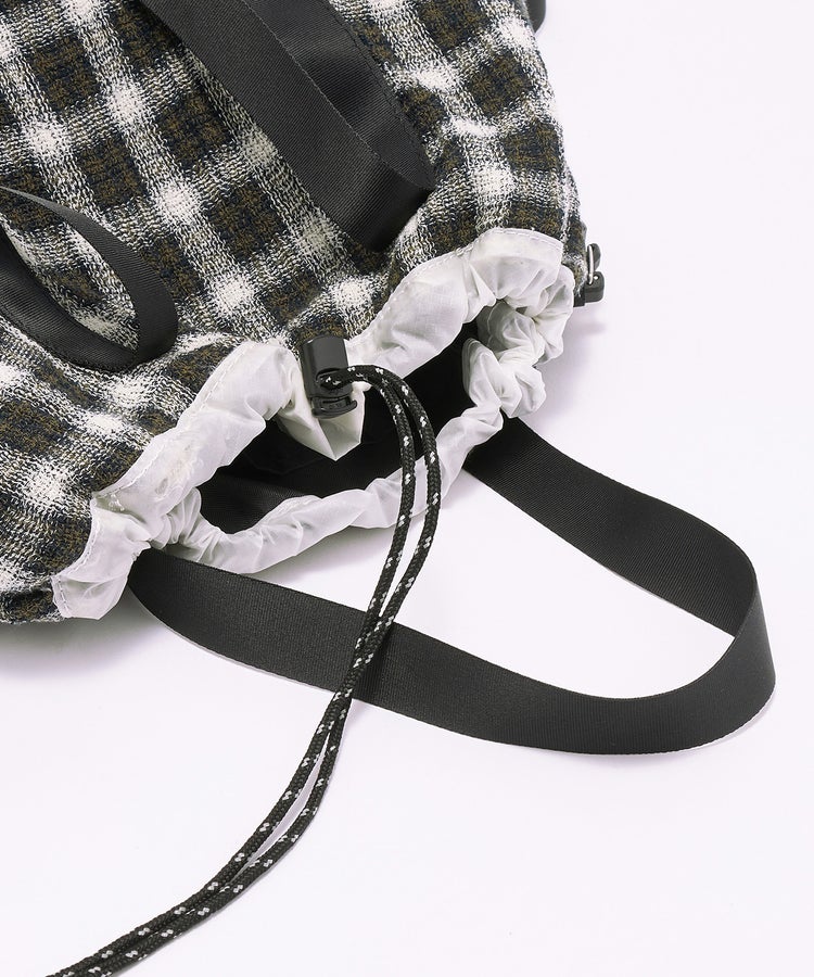 開口部にはドローコードを配し、絞ることでシルエットの変化が可能。荷物の量やスタイリングに応じてフォルムを調整できます。ショルダーパーツには、ランブリングバッグと共通の着脱式ストラップを採用。長さ調整が容易で、外せばトートバッグとしても使用できる2WAY仕様です。