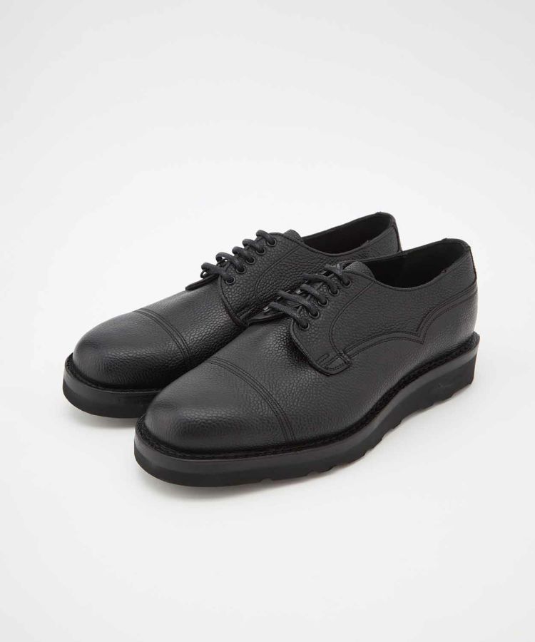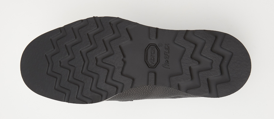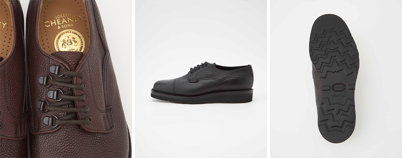 世界中から絶大な支持を集めるENGINEERED GARMENTSとの別注が実現したスペシャルモデル「CAIRNGORM EG(ケンゴン)」。 アッパーのシューレース部分の片側だけにDリングを配置して、左右からの見え方が異なるENGINEERED GARMENTSらしい仕様。5つのアイレットをDリングで置き換えるために、ジグザグに配置した他にはないデザインです。 ソールは驚くほど軽やかな履き心地を実現するVibram Morflexソールを採用。ボリュームのある見た目ながら、軽くてクッション性が高く歩きやすさは抜群です。インソール には別注の証として2ブランドのダブルネームが入っています。 ラスト(木型)は、オリジナル同様イギリスでは“ミリタリーラスト”と呼ばれている「4436」。英国軍靴に使用されていた背景を持ち、日本で展開されているモデルの木型の中でもっとも歴史が古く、75年以上前から存在すると言われています。ノーズが短く丸みを帯びた愛嬌のあるフォルムに、外羽根式でダブルのツインステッチがミリタリーシューズらしい風格。 アッパーの縫い付けは伝統的な製法“ヴェルトショーン仕様。アッパーとウェルトの隙間から雨水が染み込み、小石や土ほこりなどが侵入するのを軽減する役割があります。雨の日でも滑りにくく、作りも極めて丈夫なので、天候を問わず長く愛用いただける頼りがいのある1足です。 ◆この商品の特徴 ・ENGINEERED GARMENTS別注デザイン ・シューレース部分の片側だけにDリングを配置したアシンメトリーデザイン ・外羽根式 ・ミリタリーシューズ ・75年以上前に制作された歴史のある木型「LAST4436」 ・希少なヴェルトショーン製法 ・ホコリや雨水を防ぐベローズタン ・ダブルのツインステッチ ・ノーズが短めでボリュームのあるラウンドトゥ ・締め付け感がなくリラックスして履ける広めのウィズ ・軽くてクッション性の高いビブラムモルフレックスソール カラーバリエーション BURGUNDY BLACK ◆そもそも、ミリタリーシューズとは? その名のとおり、軍靴を由来とするミリタリーシューズ。デザイン上の大きな特徴となるのは、丸みを帯びたトウと全体的にボリュームのあるがっしりしたシェイプ。これはもともと、戦線に赴く兵士たちへ安定した品質の物資を大量に供給することが求められた戦時下において、さまざまな足の形にフィットする合理的な形状として考案されたものでした。 しかし、後年になると素朴でありながら独特な味わいがあり、男らしさを感じさせるデザインがファッションアイテムとしても注目されるようになります。過酷な戦地を踏破するために採用された頑丈な作り、そしてミリタリーシューズならではのディテールも機能美として愛好されてきました。 実はジョセフ チーニーも、英国軍への供給実績をもつブランド。当時、軍に採用されたラスト(木型)とデザインを踏襲して現在ラインナップするのが、「ケンゴン」です。タフな作りもさることながら、ミリタリーシューズならではの独特なディテールが随所に見受けられます。 ◆今や希少な「ヴェルトショーン製法」 「ケンゴン」の大きな特徴となっているのが「ヴェルトショーン製法」と呼ばれる仕立て。本格靴の主流であるグッドイヤー製法と似ていますが、こちらはソールの上を覆うようにアッパーの革を縫い付けているのがポイントです。 グッドイヤーの場合、アッパーがウェルト(アッパーとソールを繋ぐための細い帯状の革)の内側に潜り込む形になるため、この隙間から雨水や細かいホコリが靴の中に入ってきてしまいますが、隙間のないヴェルトショーンではこれを防ぐことができるというわけです。 悪路の多いミリタリーシーンで重宝されてきた作りですが、非常に手間がかかるため、今では歴史ある英国靴メーカーでもヴェルトショーン製法を行っているところはごくわずか。機能性に加えて、デザインのアクセントとしても効いています。 (上画像:ライニングを釣り込み、そしてアッパーを釣り込む前の状態。この状態からウェルトにアッパーを被せてスライスしていく) アッパーを全体に適切なテンションを掛ける為の意匠など熟練の職人技、そして専用のマシーンを必要とするため生産できる数も非常に限られる手の込んだ仕様は、まさに質実剛健さを体現した英国的ディテールの代表格。その中でもチーニーは今も尚ヴェルトショーンで作り上げることが出来る数少ないノーザンプトンのシューメーカーの1つだと言われています。 ◆ホコリや雨水を防ぐ「ベローズタン」 一見わかりにくいのですが、シューレースを外すとさらなるミリタリーディテールが。足の甲を覆う “ベロ”が羽根の部分と繋がっていることがわかります。これは「ベローズタン」と呼ばれる仕様で、トレッキングシューズなど登山靴とも共通する作りです。ベロと羽根の間からホコリや雨が入ってくるのを防ぐためのもので、上のヴェルトショーン製法と合わせて悪路対策を目的として採用されています。外からは見えないディテ