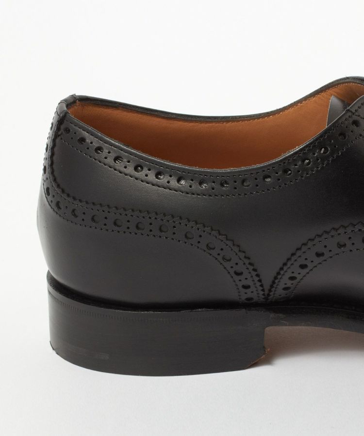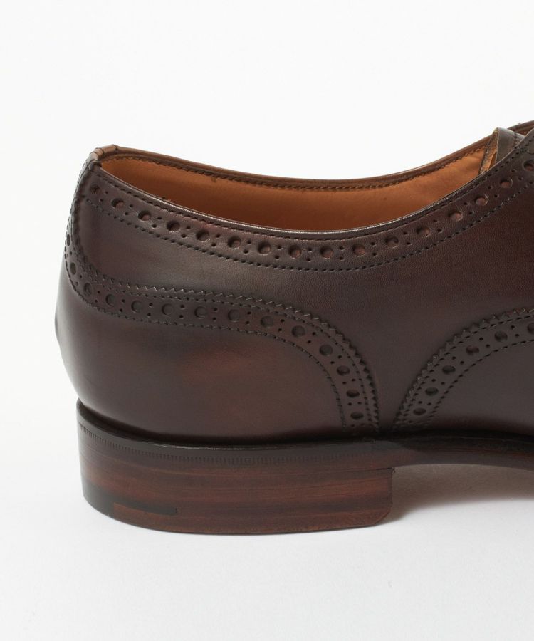 16世紀頃のスコットランドやアイルランドで履かれたブローギング(飾り穴)が施された靴は、通気性や水はけを良くする工夫としてあしらわれ、今では装飾性の高い意匠となって継承されています。控えめながらも華やかさが感じられるブローギングとトゥのメダリオンからは英国テイストが醸し出されています。内羽根式のセミブローグは都会的な印象を与え、オンからオフまで幅広い着こなしに合わせることができます。ソールに関しては気品がある雰囲気があり、使い込む事で経年変化が楽しめるシングルレザーソールです。