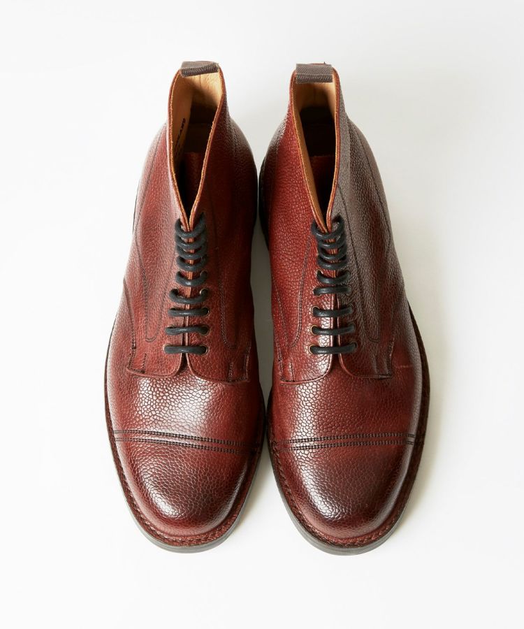 英国軍へ納入実績のあるラスト4436、通称“ミリタリーラスト”の、傷・汚れ(水濡れ)にも強い大粒のシボが特徴的なグレインカーフレザーを採用しています。無骨ながらも愛らしい面構え、独特のステッチワーク、かかと周りにまでぐるりとコバがあしらわれたオールアラウンドグッドイヤーウェルト製法など、カントリーテイストを彷彿させるディテール。一般的なグッドイヤーウェルトではなく、アッパーをウェルトの上側に縫い付けたヴェルトショーン仕様を採用し、ホコリや雨水が入りにくい作りとなっています。ソールにはグリップ力があり悪路にも強いコマンドソールを使っているため、雨の日でも滑りにくくオールシーズン快適に歩くことができます。