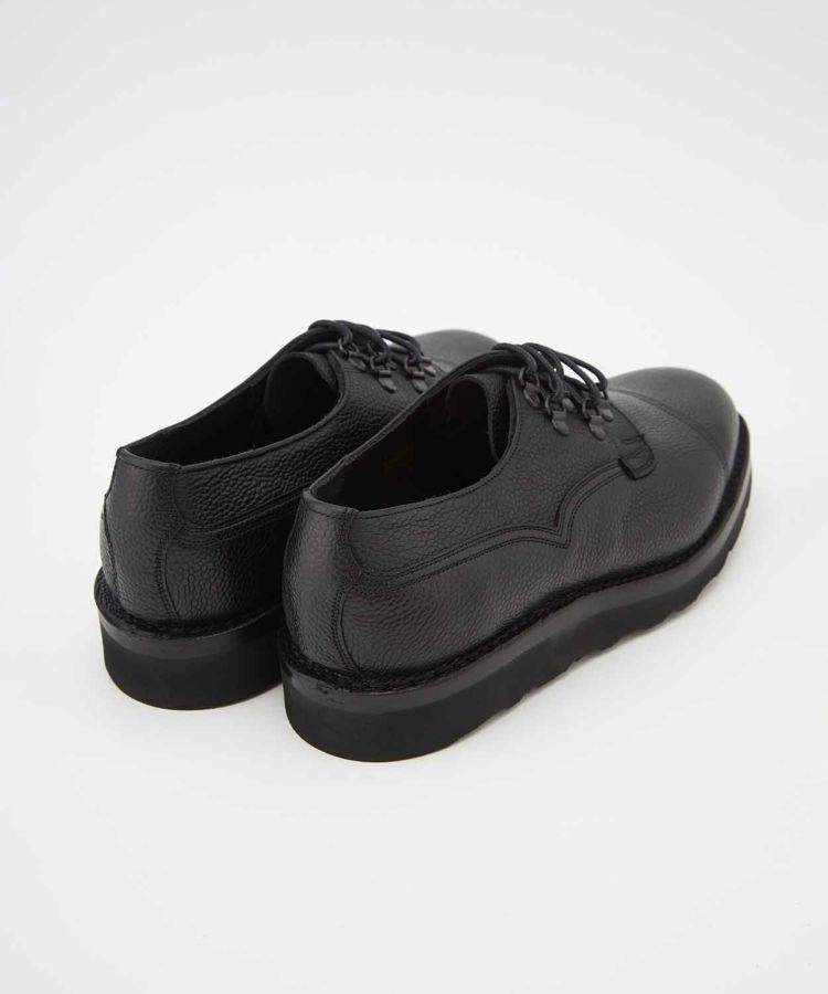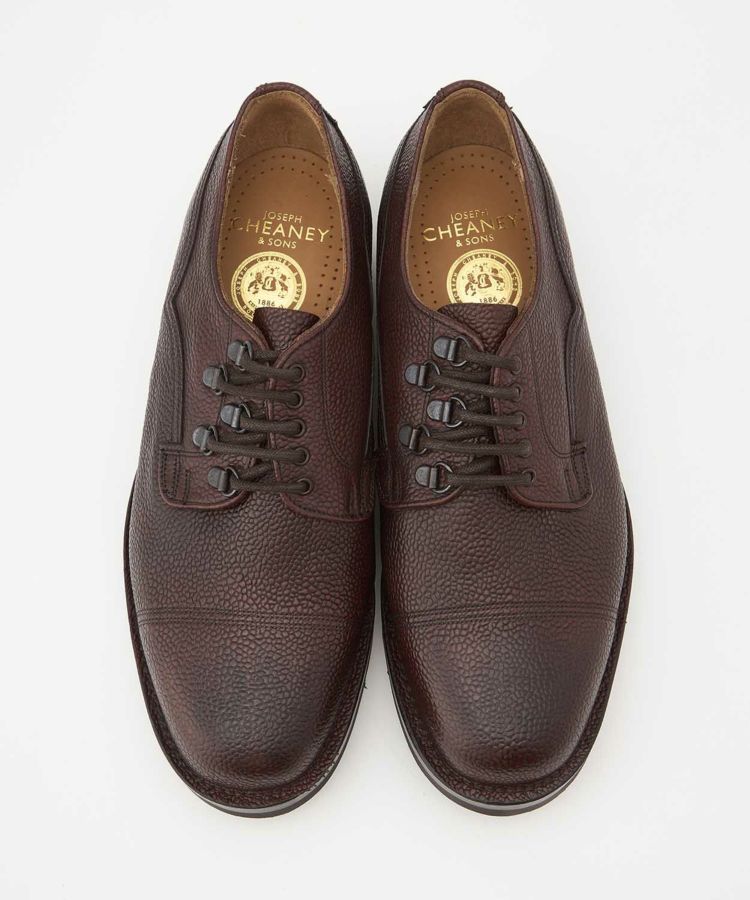 世界中から絶大な支持を集めるENGINEERED GARMENTSとの別注が実現したスペシャルモデル「CAIRNGORM EG(ケンゴン)」。 アッパーのシューレース部分の片側だけにDリングを配置して、左右からの見え方が異なるENGINEERED GARMENTSらしい仕様。5つのアイレットをDリングで置き換えるために、ジグザグに配置した他にはないデザインです。 ソールは驚くほど軽やかな履き心地を実現するVibram Morflexソールを採用。ボリュームのある見た目ながら、軽くてクッション性が高く歩きやすさは抜群です。インソール には別注の証として2ブランドのダブルネームが入っています。 ラスト(木型)は、オリジナル同様イギリスでは“ミリタリーラスト”と呼ばれている「4436」。英国軍靴に使用されていた背景を持ち、日本で展開されているモデルの木型の中でもっとも歴史が古く、75年以上前から存在すると言われています。ノーズが短く丸みを帯びた愛嬌のあるフォルムに、外羽根式でダブルのツインステッチがミリタリーシューズらしい風格。 アッパーの縫い付けは伝統的な製法“ヴェルトショーン仕様。アッパーとウェルトの隙間から雨水が染み込み、小石や土ほこりなどが侵入するのを軽減する役割があります。雨の日でも滑りにくく、作りも極めて丈夫なので、天候を問わず長く愛用いただける頼りがいのある1足です。 ↓このアイテムを使った関連記事はこちら↓ ・〈ENGINEERED GARMENTS〉 X 〈JOSEPH CHEANEY〉コラボレーションモデルが初登場 ◆この商品の特徴 ・ENGINEERED GARMENTS別注デザイン ・シューレース部分の片側だけにDリングを配置したアシンメトリーデザイン ・外羽根式 ・ミリタリーシューズ ・75年以上前に制作された歴史のある木型「LAST4436」 ・希少なヴェルトショーン製法 ・ホコリや雨水を防ぐベローズタン ・ダブルのツインステッチ ・ノーズが短めでボリュームのあるラウンドトゥ ・締め付け感がなくリラックスして履ける広めのウィズ ・軽くてクッション性の高いビブラムモルフレックスソール カラーバリエーション BURGUNDY BLACK ◆そもそも、ミリタリーシューズとは? その名のとおり、軍靴を由来とするミリタリーシューズ。デザイン上の大きな特徴となるのは、丸みを帯びたトウと全体的にボリュームのあるがっしりしたシェイプ。これはもともと、戦線に赴く兵士たちへ安定した品質の物資を大量に供給することが求められた戦時下において、さまざまな足の形にフィットする合理的な形状として考案されたものでした。 しかし、後年になると素朴でありながら独特な味わいがあり、男らしさを感じさせるデザインがファッションアイテムとしても注目されるようになります。過酷な戦地を踏破するために採用された頑丈な作り、そしてミリタリーシューズならではのディテールも機能美として愛好されてきました。 実はジョセフ チーニーも、英国軍への供給実績をもつブランド。当時、軍に採用されたラスト(木型)とデザインを踏襲して現在ラインナップするのが、「ケンゴン」です。タフな作りもさることながら、ミリタリーシューズならではの独特なディテールが随所に見受けられます。 ◆今や希少な「ヴェルトショーン製法」 「ケンゴン」の大きな特徴となっているのが「ヴェルトショーン製法」と呼ばれる仕立て。本格靴の主流であるグッドイヤー製法と似ていますが、こちらはソールの上を覆うようにアッパーの革を縫い付けているのがポイントです。 グッドイヤーの場合、アッパーがウェルト(アッパーとソールを繋ぐための細い帯状の革)の内側に潜り込む形になるため、この隙間から雨水や細かいホコリが靴の中に入ってきてしまいますが、隙間のないヴェルトショーンではこれを防ぐことができるというわけです。 悪路の多いミリタリーシーンで重宝されてきた作りですが、非常に手間がかかるため、今では歴史ある英国靴メーカーでもヴェルトショーン製法を行っているところはごくわずか。機能性に加えて、デザインのアクセントとしても効いています。 (上画像:ライニングを釣り込み、そしてアッパーを釣り込む前の状態。この状態からウェルトにアッパーを被せてスライスしていく) アッパーを全体に適切なテンションを掛ける為の意匠など熟練の職人技、そして専用のマシーンを必要とするため生産できる数も非常に限られる手の込んだ仕様は、まさに質実剛健さを体現した英国的ディテールの代表格。その中でもチーニーは今も尚ヴェルトショーンで作り上げることが出来る数少ないノーザンプトンのシューメーカーの1つだと言われています。 ◆ホコリや雨水を防ぐ「ベローズタン」 一見わかりにくいのですが、シューレースを外すとさらなるミリタリーディテールが。足の甲を覆う “ベロ”が羽根の部分と繋がっていることがわかります。これは「ベローズタン」と呼ばれる仕様で、トレッキングシューズなど登山靴とも共通する作りです。ベロと羽根の間からホコリや雨が入ってくるのを防ぐた