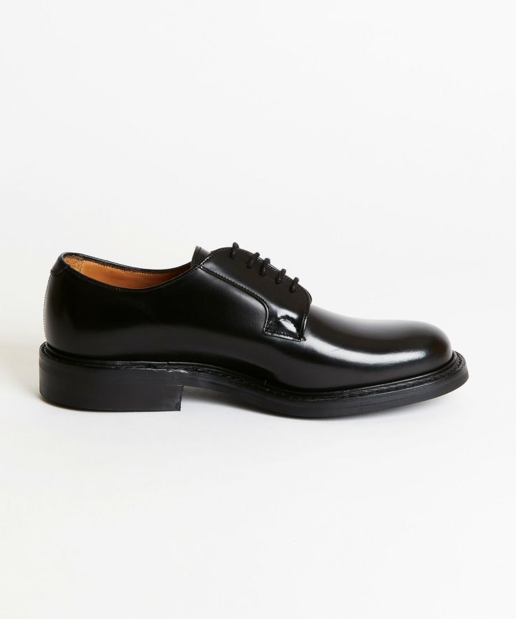 木型は12508ラストを採用。プレーントゥと木型のバランスが合間ってブリティッシュトラッド好きの方には堪らないデザインです。アッパーはブラックハイシャインというコーティングレザーで、さりげなく輝く絶妙な光沢感が好印象。サッとブラシで磨くだけで光沢感が蘇るところもポイントです。ストームウェルト仕様で、コバ周りの防塵や浸水を防いでくれる実用性も備え、ダイナイトソールで接地面が少なく、悪路の中でも滑りにくい特性があることも魅力です。程よいボリューム感で、ドレスとカジュアルの要素が融合されオンオフ問わず着用いただけます。