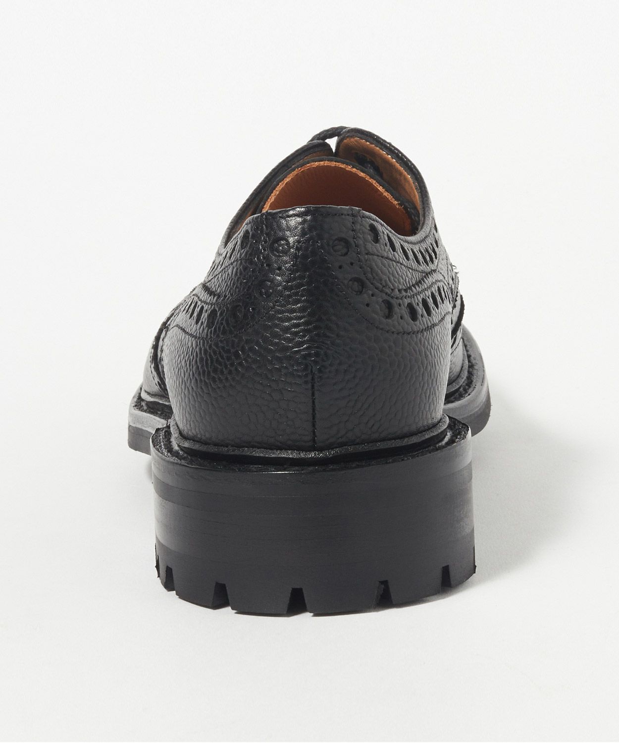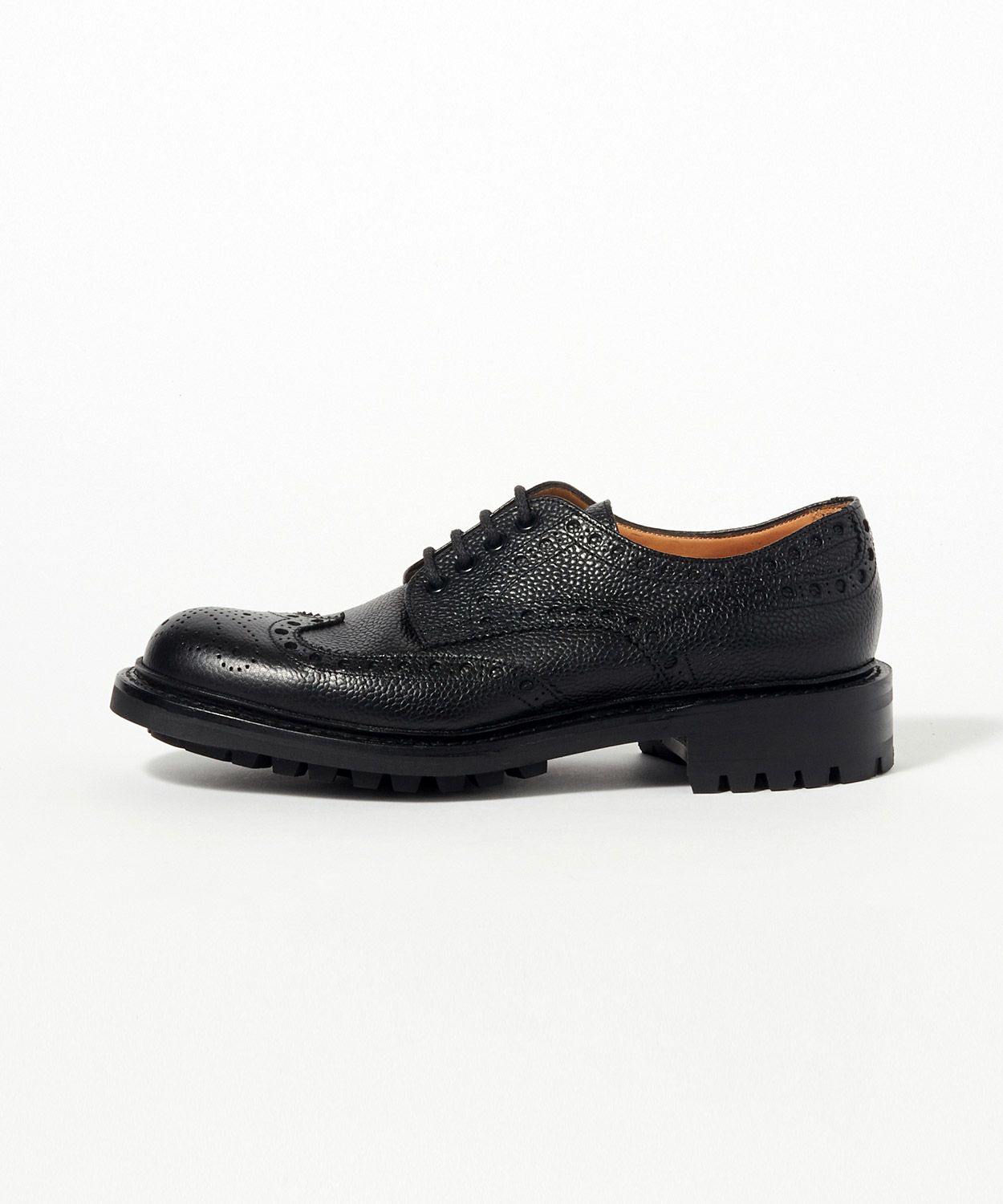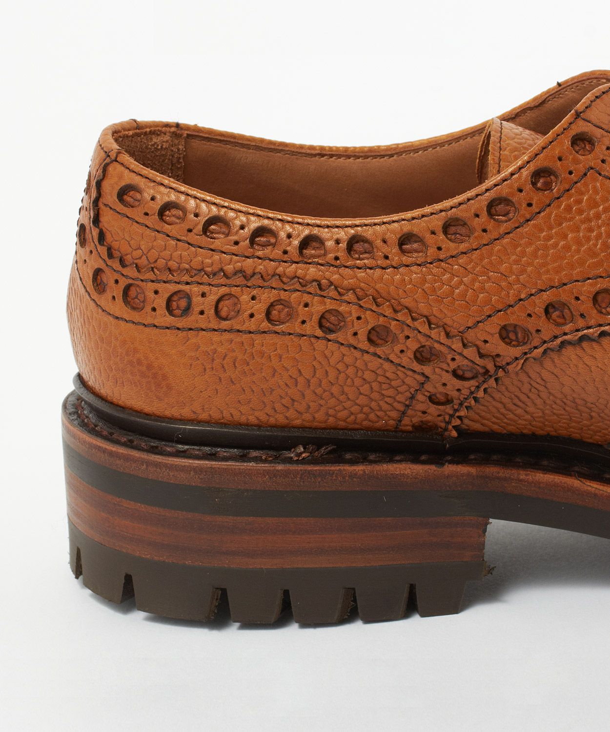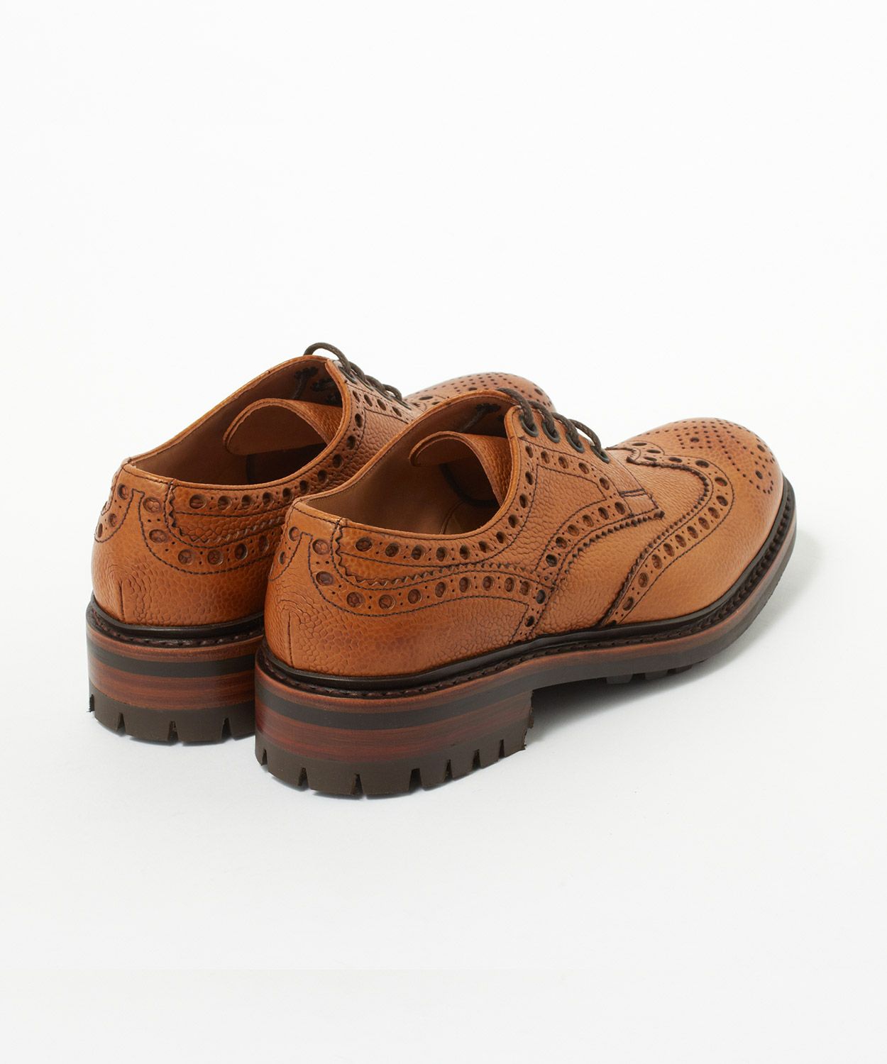 バランスの良いフォルムに穴取りの大きいブローグ、ぽってりとしたラウンドトゥ、頑強なグッドイヤーウェルト製法、厚みのあるソールなど、無骨さと洗練さを兼ね備えたトラディショナルなカントリーシューズ。アッパーレザーに傷・汚れ(水濡れ)にも強い大粒のシボが特徴のグレインカーフ、アッパーとソールの隙間をふさぐように取り付けられたスプリットウェルト、さらにアウトソールにはグリップ力のあるコマンドソールを採用することにより、荒れた路面や雨にも対応できるようにしています。