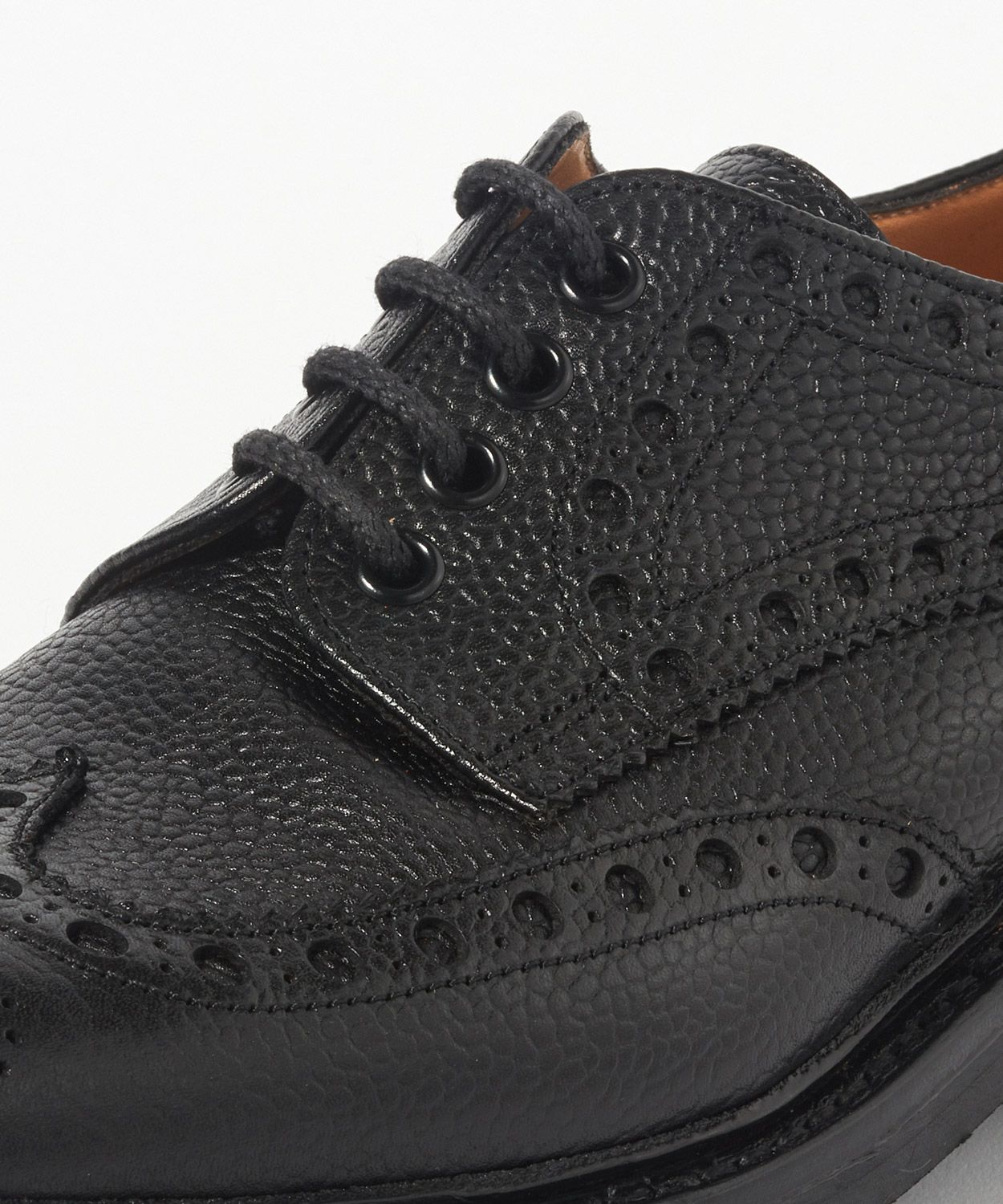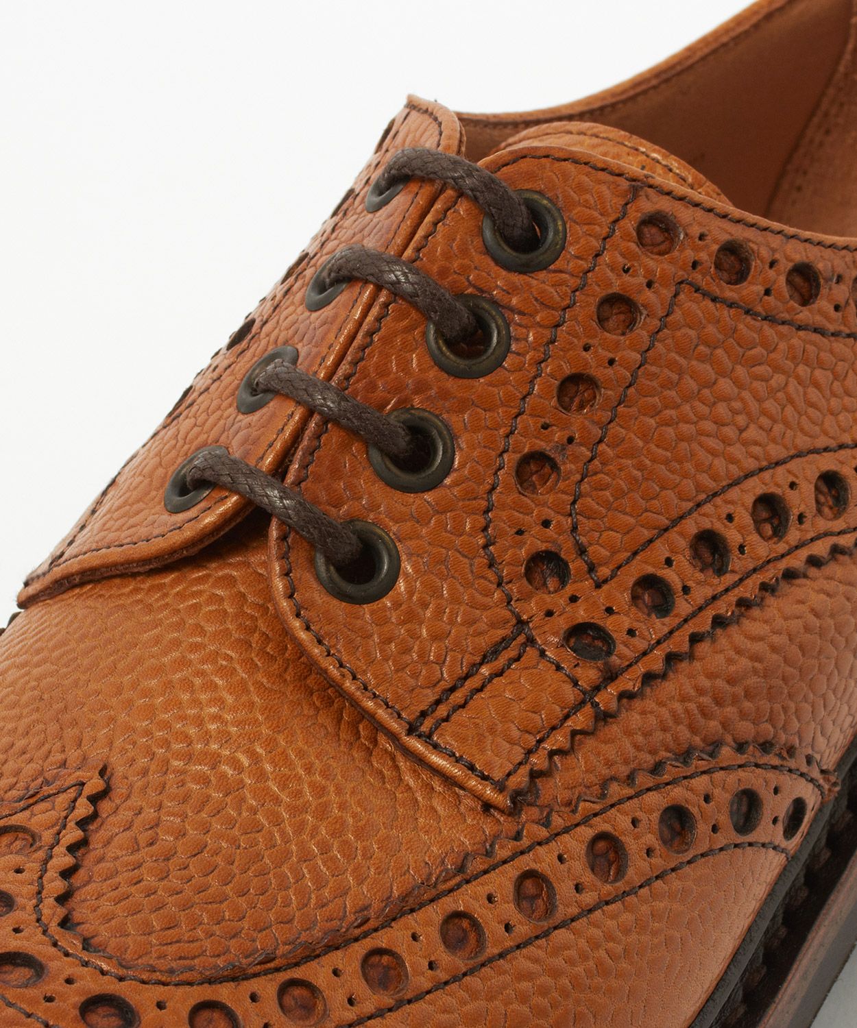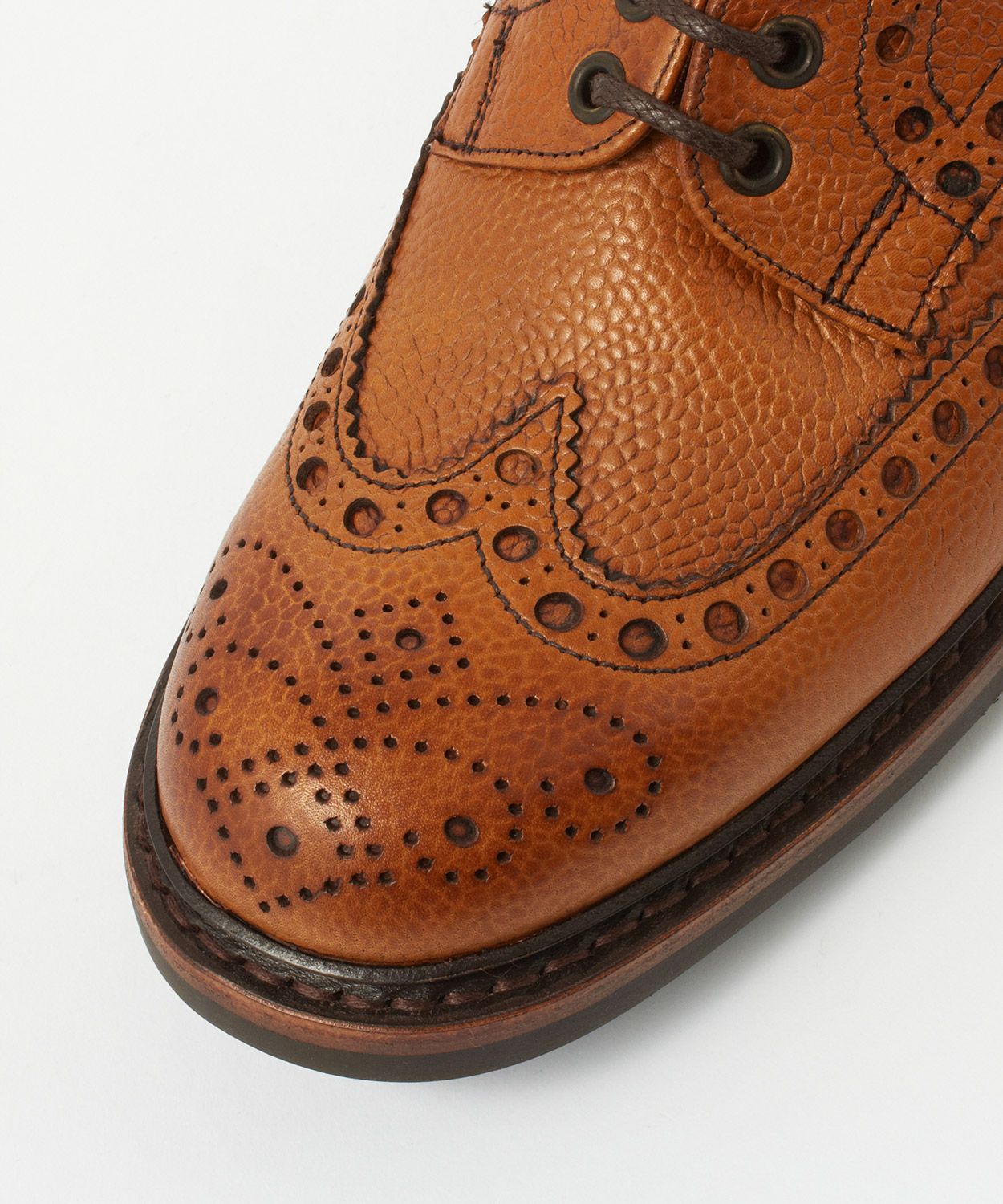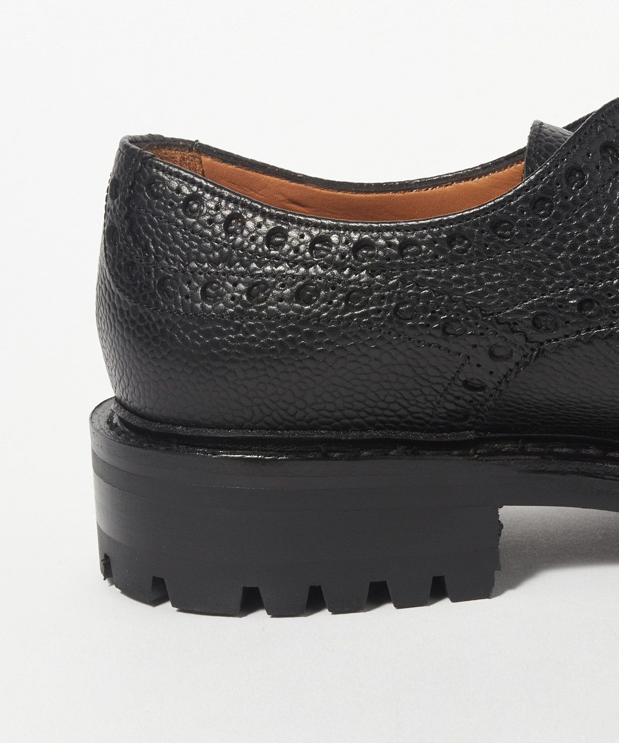 大小の穴飾りをライン状に配したブローギングとトゥのメダリオン。これによってカジュアル感の高い顔つきを演出しています。加えて、ぽってりとボリュームのあるラウンドトゥもカントリーシューズらしさの源。トゥにあしらわれたメダリオンはブランドごとに独自の図案を採用していて、紋章のような役割も果たしています。