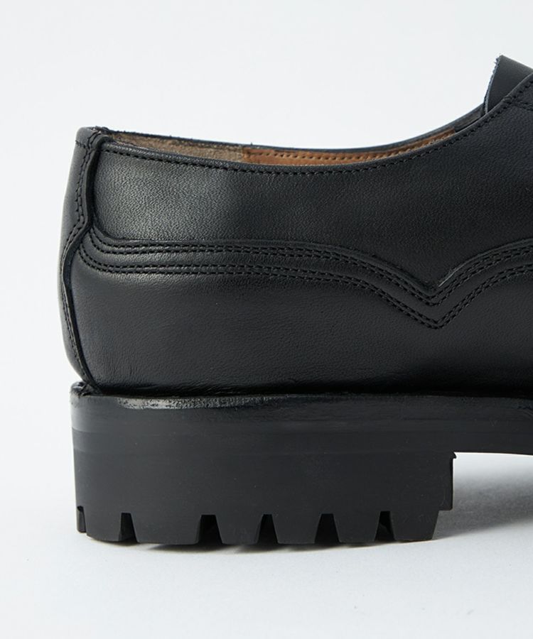 ラスト(木型)は、イギリスでは“ミリタリーラスト”と呼ばれている「4436」。英国軍靴に使用されていた背景を持ち、日本で展開されているモデルの木型の中でもっとも歴史が古く、75年以上前から存在すると言われています。ノーズが短く丸みを帯びた愛嬌のあるフォルムに、外羽根式でダブルのツインステッチが風格を表現します。