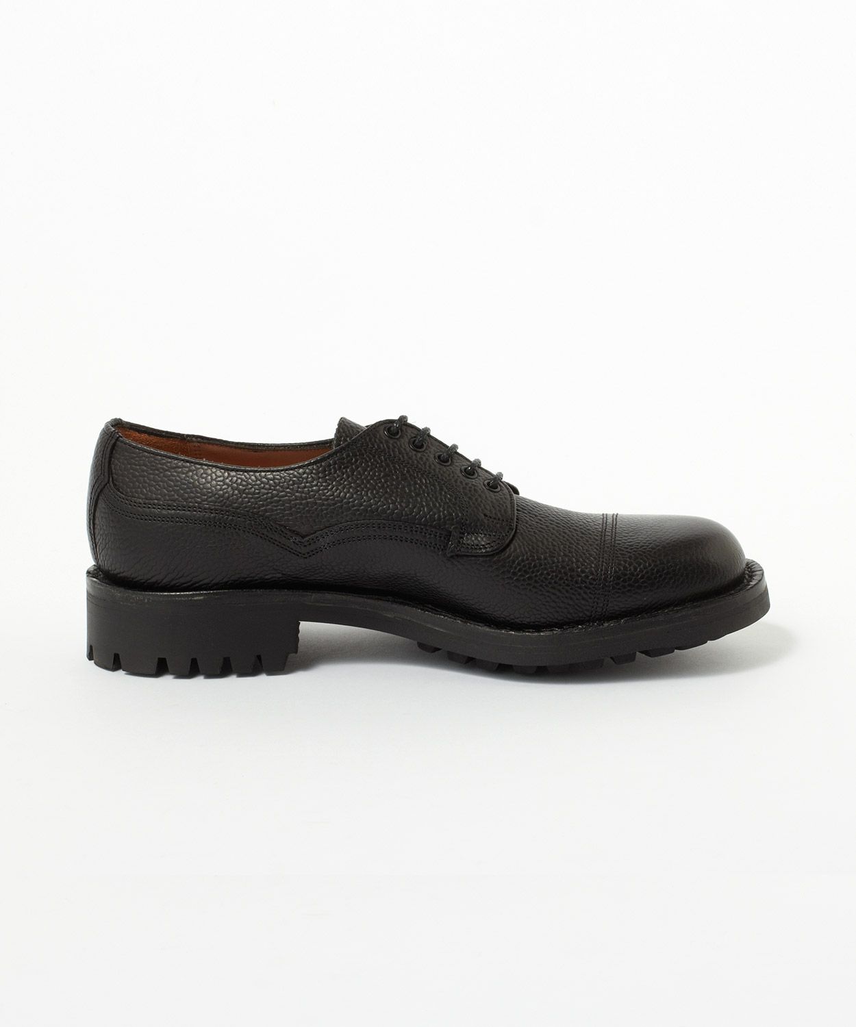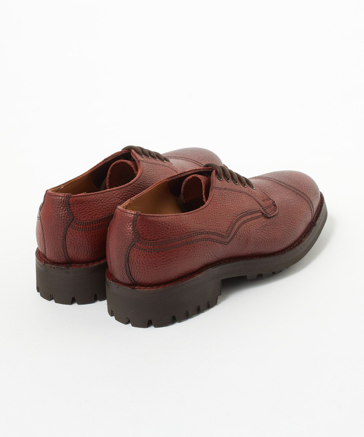 重厚な見た目ながら品の良さを備えた「CAIRNGORM 2R(ケンゴン)」。 ジョセフ チーニーを代表するモデルの一つで、そのクラシックで英国的なデザインと、耐久性のあるグッドイヤーウェルト構造により、イギリスのみならず日本でも絶大な支持を得ています。 ラスト(木型)は、イギリスでは“ミリタリーラスト”と呼ばれている「4436」。英国軍靴に使用されていた背景を持ち、日本で展開されているモデルの木型の中でもっとも歴史が古く、75年以上前から存在すると言われています。ノーズが短く丸みを帯びた愛嬌のあるフォルムに、外羽根式でダブルのツインステッチがミリタリーシューズらしい風格に。 機能面も申し分なく、アッパーの縫い付けに伝統的な製法“ヴェルトショーン仕様”を採用。アッパーとウェルトの隙間から雨水が染み込み、小石や土ほこりなどが侵入するのを軽減する役割があります。 日常使いから、カジュアルなビジネスシーンまでお使いいただける頼りがいのある1足。雨の日でも滑りにくく、作りも極めて丈夫なので、天候を問わず長く愛用いただけます。 ↓このアイテムを使った関連記事はこちら↓ ・スタイリスト四方さんが提案!2025年冬のブリティッシュスタイル5選 ・実はこれ、ずっと売れてます。Vol. 3 〈ジョセフ チーニー〉のケンゴン ・【10月1日価格改定】ジョセフ チーニー 2025年上半期 人気ランキング|メンズ、ウィメンズ ・アラサー男子3人衆、夏のボーナスショッピング座談会|英国靴&バッグが狙い目 ・《買ってよかった》いまの自分に欠かせないモノ。#スタッフの偏愛品 Vol. 10【革靴編】 ・エイジングギャラリー/スタッフが履くジョセフ チーニーのCAIRNGORM 2R(ケンゴン 2R) ・[STAFF STORIES] ファッションの世界を駆け抜けて、今惚れ込むのはジョセフ チーニーのプレーントゥ ・ジョセフ チーニーの名作「ケンゴン」のバリエーションを徹底比較! ◆この商品の特徴 ・外羽根式 ・ミリタリーシューズ ・75年以上前に制作された歴史のある木型「LAST4436」 ・希少なヴェルトショーン製法 ・ホコリや雨水を防ぐベローズタン ・ダブルのツインステッチ ・ノーズが短めでボリュームのあるラウンドトゥ ・締め付け感がなくリラックスして履ける広めのウィズ ・悪路をものともしないコマンドソール カラーバリエーション BURGUNDY BLACK ALMOND ※製造時期により靴の内側の表記が「CAIRNGORM 2C」となっている場合がございます。商品の仕様に違いはございませんので、ご安心くださいませ。(2R=ラバーソール、2C=コマンドソールを意味しており、どちらも同じラバーソールとなります) ◆そもそも、ミリタリーシューズとは? その名のとおり、軍靴を由来とするミリタリーシューズ。デザイン上の大きな特徴となるのは、丸みを帯びたトウと全体的にボリュームのあるがっしりしたシェイプ。これはもともと、戦線に赴く兵士たちへ安定した品質の物資を大量に供給することが求められた戦時下において、さまざまな足の形にフィットする合理的な形状として考案されたものでした。 しかし、後年になると素朴でありながら独特な味わいがあり、男らしさを感じさせるデザインがファッションアイテムとしても注目されるようになります。過酷な戦地を踏破するために採用された頑丈な作り、そしてミリタリーシューズならではのディテールも機能美として愛好されてきました。 実はジョセフ チーニーも、英国軍への供給実績をもつブランド。当時、軍に採用されたラスト(木型)とデザインを踏襲して現在ラインナップするのが、「ケンゴン 2R」です。タフな作りもさることながら、ミリタリーシューズならではの独特なディテールが随所に見受けられます。 ◆今や希少な「ヴェルトショーン製法」 「ケンゴン2R」の大きな特徴となっているのが「ヴェルトショーン製法」と呼ばれる仕立て。本格靴の主流であるグッドイヤー製法と似ていますが、こちらはソールの上を覆うようにアッパーの革を縫い付けているのがポイントです。 グッドイヤーの場合、アッパーがウェルト(アッパーとソールを繋ぐための細い帯状の革)の内側に潜り込む形になるため、この隙間から雨水や細かいホコリが靴の中に入ってきてしまいますが、隙間のないヴェルトショーンではこれを防ぐことができるというわけです。 悪路の多いミリタリーシーンで重宝されてきた作りですが、非常に手間がかかるため、今では歴史ある英国靴メーカーでもヴェルトショーン製法を行っているところはごくわずか。機能性に加えて、デザインのアクセントとしても効いています。 (上画像:ライニングを釣り込み、そしてアッパーを釣り込む前の状態。この状態からウェルトにアッパーを被せてスライスしていく) アッパーを全体に適切なテンションを掛ける為の意匠など熟練の職人技、そして専用のマシーンを必要とするため生産できる数も非常に限られる手の込んだ仕様は、まさに質実剛健さを体現した英国的ディテールの代表格。その中