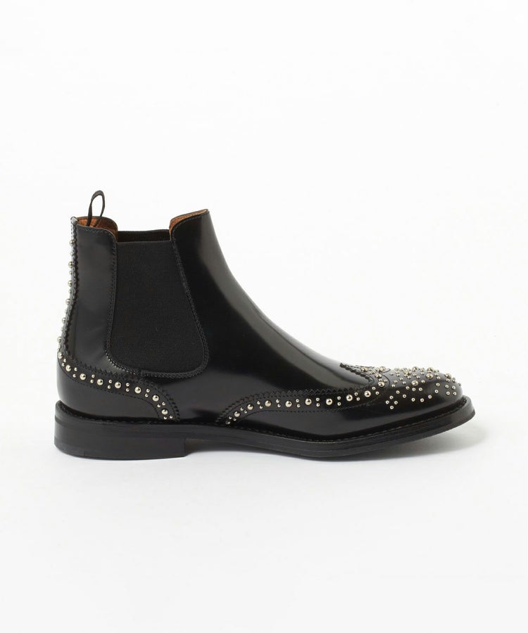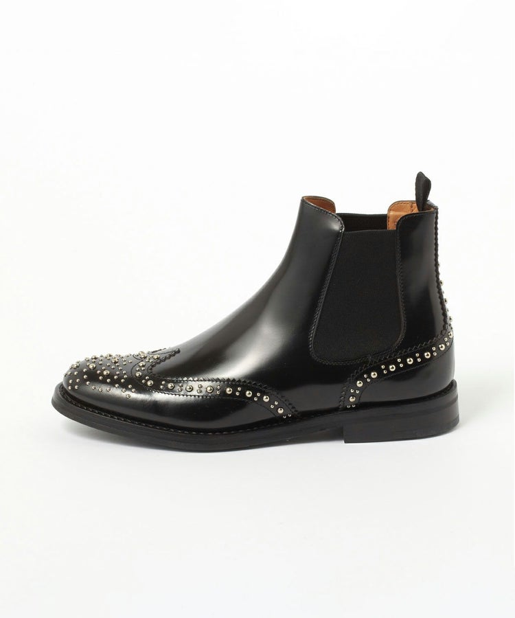 ウィングチップのクラシカルな表情に大小のドットスタッドが付いた他には無いチャーチならではのデザイン。メタリックな光沢により、ほどよくシャープさも加わっています。サイズ感では、サイドゴアブーツタイプの特性上、定番BURWOOD(バーウッド)よりも少し大きめに感じられる方もいらっしゃいます。ソールはラバー(ゴム)素材を使用しているため、滑りにくく機能性も兼ね備えています。