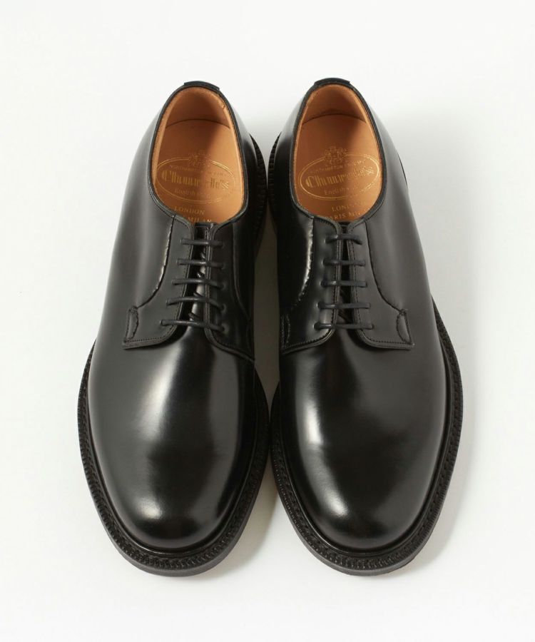 ハンドステッチの工程が今でも残る、ダービー型のレースアップシューズSHANNON(シャノン)。 チャーチを語る上では欠かせないポリッシュドバインダーカーフがアッパーに使用されており、艶やかな質感が光ります。トゥに張り出したコバにはストームウェルトが採用され、雨や埃の侵入を程良く防いでくれます。分厚いトリプルソール仕上げの無骨なプレーントゥも相まって、非常に堅牢でボリューム感溢れる仕上がりです。シューレースを通す穴に沿って施されたスキンステッチは、チャーチの技術力が伺える大きな特徴の一つ。カジュアルシーンにもスーツスタイルにも使って頂きたい名品は、末長くお使いいただける逸品。履き込める良き相棒となり、愛着のある姿が期待できます。 ◆この商品の特徴 ・汎用性の高い重厚感のあるフォルム ・フィッティング F ・グッドイヤー・ウェルテッド製法 ・007シリーズ 『007/慰めの報酬』ジェームズ・ボンド着用モデル ・1970年誕生モデル ・チャーチを代表するモデルの一つ カラーバリエーション BLACK LIGHT EBONY ◆103 LAST(木型) 丸みの帯びたトゥ(つま先)が特徴のラスト。チャーチの定番ラスト173に比べ、つま先にゆとりが感じられるデザイン。SHANNON(シャノン)のようにボリューム感のあるシューズに用いられています。 ◆英国らしい実用性を添えるポリッシュドバインダーカーフ アッパーには、チャーチを語る上では欠かせない“ポリッシュドバインダーカーフ”が使用されています。ポリッシュドバインダーカーフはレザーの表面に特殊な樹脂加工を施すことで、通常のカーフよりも光沢感が増し、さらには防水性も高める実用性を備えています。この上品な艶は、コードバンとは異なった独特の味わいがあり、傷や汚れも付きにくくデイリーケアも容易。少し曇ってきたらブラシやクロスで簡単に磨くだけで光沢感も蘇ってくれます。 ◆シンプルなデザインを昇華する細かな意匠 “シャノン”にはチャーチの技術力が伺える意匠の数々が張り巡らされています。例えば、ウェルトの出し縫いの糸を目立たなくさせるためのコバ周りの目付けには、大胆な面取り目付けを。また、シューレースを通す穴に沿って施されたスキンステッチや履き口に施されるハーフムーンステッチは、手縫いで仕上げられた非常に手の込んだ“シャノン”の特徴的なディテールの1つです。 また、トゥに張り出したコバにはストームウェルトが採用され、雨やホコリの侵入を程良く防いでくれます。さらに、外観からは見えない足の甲を覆う部分も“ベローズタン”と呼ばれる羽根部分とベロを繋げる仕様によって、同様に防滴防塵性を高めてくれています。職人らしい堅牢なディテールと共に、防塵対策といった英国靴らしい実用さを添えてくれます。 ◆デイリーシューケアの方法 Church’s ポリッシュドバインダーカーフ“シューケアバイブル” 5つの要点を解説 シューツリー:1.革靴のお手入れと保管にはシューツリーがマスト 様々な靴にマッチする木型で、本体、ヒール部分共に細身にシェイプされており、余分なふくらみを靴に与えません。頑丈で吸湿性に優れたブナ材を使用しています。愛用の靴をムレや型崩れから守ってくれます。 馬毛ブラシ:2.汚れやホコリをブラッシングで除去 汚れやホコリを落とすため、汚れ落とし用ブラシでブラッシングをします。コバ周りや溝、飾り穴などの細かい部分もしっかりブラッシングしましょう。馬毛のブラシは毛先が細くしなやかなため、汚れ落としにはベターです。 ポリッシュクロス:3.あとは乾拭きだけでOK!日頃のお手入れならこれで充分 クロスでから拭きをして光沢感を甦らせます。元々樹脂加工の施されたポリッシュドバインダーカーフなので、お手入れが手軽なのが最大のポイント。簡単な日頃のケアならこの程度ですぐに輝きが甦ります。 ◆より長くご愛用いただくために BRITISH MADEオリジナル メンズシューツリー ¥13,200(税込) シューツリーは、靴を大切に長くご愛用いただくための必須アイテム。愛用の靴をムレや型崩れから守ってくれる他、靴磨きの際にも入れておくと形が維持されるので磨きやすくなります。 BRITISH NOTE 08 Church’s/ポリッシュドバインダーカーフの魅力 Church's / チャーチ Church’sは1873年、靴作りの町として有名なノーサンプトンで創業しました。正統派の英国靴として不動の地位を確立し、欧米のセレブリティや007のジェームズボンドも愛用することで知られています。チャーチのウェルト・シューズはグッドイヤー・ウェルト製法により、1足あたり250にもおよぶ工程を経て作られています。