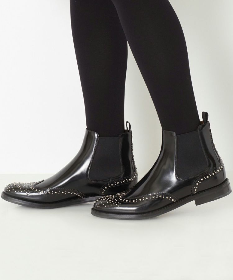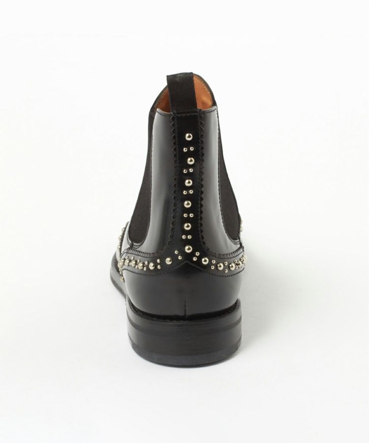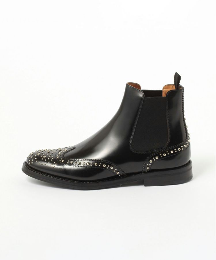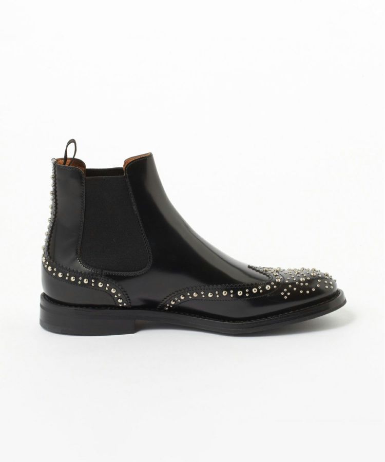 スタッド付き定番サイドゴアタイプのショートブーツ、KETSBY(ケツビー)。 ウィングチップのクラシカルな表情に大小のドットスタッドが付いた他には無いチャーチならではのデザイン。メタリックな光沢により、ほどよくシャープさも加わっています。サイズ感では、サイドゴアブーツタイプの特性上、定番BURWOOD(バーウッド)よりも少し大きめに感じられる方もいらっしゃいます。ソールはラバー(ゴム)素材を使用しているため、滑りにくく機能性も兼ね備えています。 ◆この商品の特徴 ・脱ぎ履きしやすいサイドゴアブーツ ・ポリッシュドバインダーカーフ ・ソールはラバーソール(ゴム製のソール)素材 ※ブーツの全ラインアップはこちらから。 ◆雨の日にも活躍する嬉しいラバーソール仕様 細かな刻みが入った“ダイヤモンドラバーソール”と呼ばれるゴム素材のソールが多く採用されています。サイドビューのルックスは、レザーソールのようにすっきりと薄く、ドレッシーな印象に。それでいて雨の日にもグリップ性を確保してくれるという嬉しい仕様。革靴らしいキレイ目なルックスをキープしながら、急な雨の日にも活躍してくれる実用的なソールです。 ※入荷時期により裏面出し縫い糸のカラーをホワイトからブラックへ変更した商品がございます。予めご了承いただき、お買い求めいただきますようお願い申し上げます。 ※Church's専用のシューツリー(シューキーパー)をご用意しています。シューツリをあわせてご検討の方はこちらから。 ◆デイリーシューケアの方法 Church’s ポリッシュドバインダーカーフ“シューケアバイブル” 5つの要点を解説 シューツリー:1.革靴のお手入れと保管にはシューツリーがマスト 様々な靴にマッチする木型で、本体、ヒール部分共に細身にシェイプされており、余分なふくらみを靴に与えません。頑丈で吸湿性に優れたブナ材を使用しています。愛用の靴をムレや型崩れから守ってくれます。 馬毛ブラシ:2.汚れやホコリをブラッシングで除去 汚れやホコリを落とすため、汚れ落とし用ブラシでブラッシングをします。コバ周りや溝、飾り穴などの細かい部分もしっかりブラッシングしましょう。馬毛のブラシは毛先が細くしなやかなため、汚れ落としにはベターです。 ポリッシュクロス:3.あとは乾拭きだけでOK!日頃のお手入れならこれで充分 クロスでから拭きをして光沢感を甦らせます。元々樹脂加工の施されたポリッシュドバインダーカーフなので、お手入れが手軽なのが最大のポイント。簡単な日頃のケアならこの程度ですぐに輝きが甦ります。 ◆より長くご愛用いただくために BRITISH MADEオリジナル レディースシューツリー ¥7,920(税込) シューツリーは、靴を大切に長くご愛用いただくための必須アイテム。愛用の靴をムレや型崩れから守ってくれる他、靴磨きの際にも入れておくと形が維持されるので磨きやすくなります。 BRITISH NOTE 08 Church’s/ポリッシュドバインダーカーフの魅力 Church's / チャーチ Church’sは1873年、靴作りの町として有名なノーサンプトンで創業しました。正統派の英国靴として不動の地位を確立し、欧米のセレブリティや007のジェームズボンドも愛用することで知られています。チャーチのウェルト・シューズはグッドイヤー・ウェルト製法により、1足あたり250にもおよぶ工程を経て作られています。