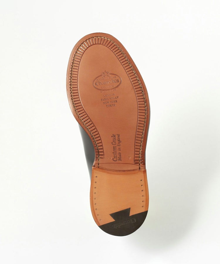 アッパーには、チャーチを語る上では欠かせない“ポリッシュドバインダーカーフ”が使用されています。ポリッシュドバインダーカーフはレザーの表面に特殊な樹脂加工を施すことで、通常のカーフよりも光沢感が増し、さらには防水性も高める実用性を備えています。この上品な艶は、コードバンとは異なった独特の味わいがあり、傷や汚れも付きにくくデイリーケアも容易。少し曇ってきたらブラシやクロスで簡単に磨くだけで光沢感も蘇ってくれます。