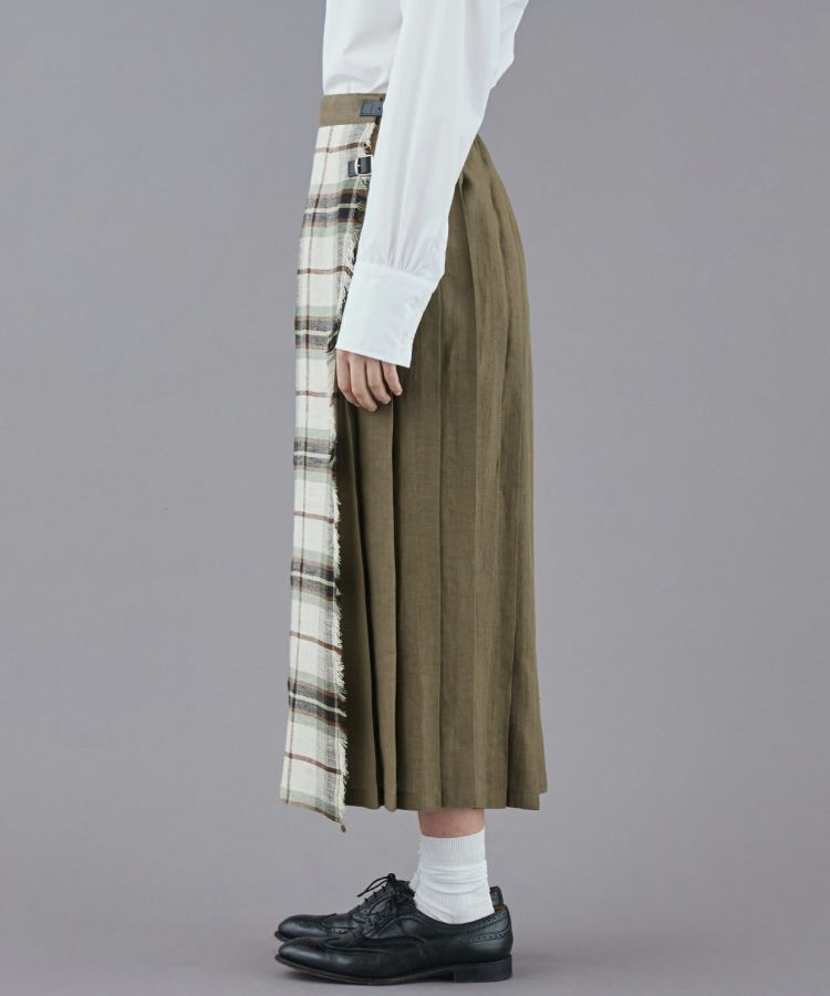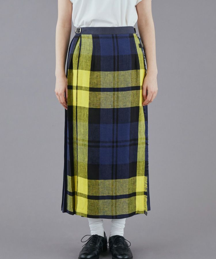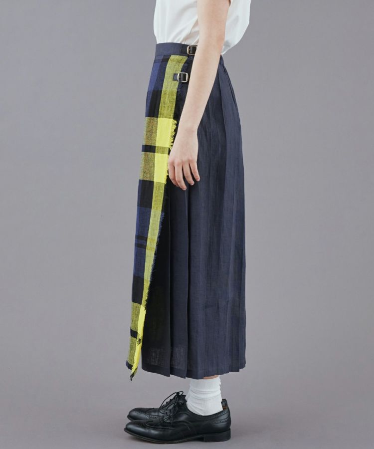 軽やかで涼しげなリネン素材をベースに、フロントパネルデザインはフリンジがアクセント。歩くたびに揺れるバックプリーツとタックインした時アクセントになるウエストベルト、サイドに施された3つのレザーベルトがコーディネートを引き締めます。バックウエストにはゴムが施されているためストレスフリーな着心地。シンプルなトップスを合わせることで、キルトスカートの魅力がより引き立ちます。