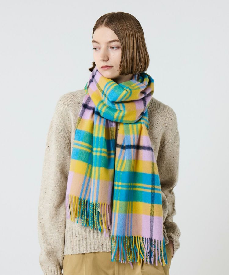 柄はクラシックなタータンチェックをベースに、印象的な配色をピックアップ。派手すぎず、それでいて確かな存在感を放つバランスにこだわりました。重くなりがちな秋冬のコーディネートを、ひと巻きで華やかに、そして品よく仕上げてくれます。