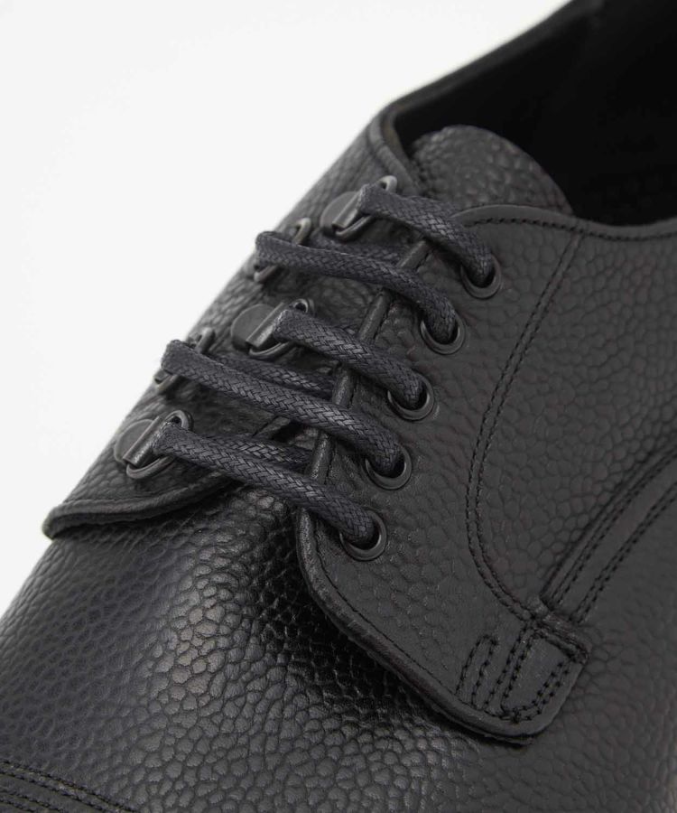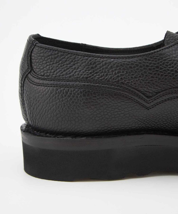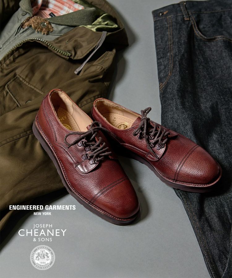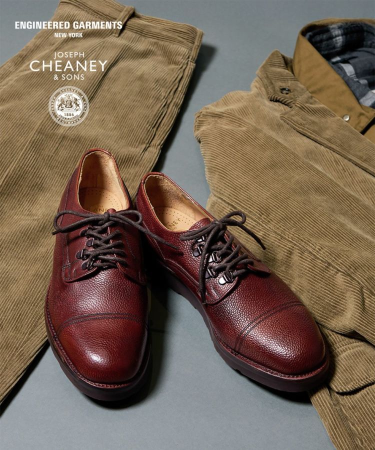 世界中から絶大な支持を集めるENGINEERED GARMENTSとの別注が実現したスペシャルモデル「CAIRNGORM EG(ケンゴン)」。 アッパーのシューレース部分の片側だけにDリングを配置して、左右からの見え方が異なるENGINEERED GARMENTSらしい仕様。5つのアイレットをDリングで置き換えるために、ジグザグに配置した他にはないデザインです。 ソールは驚くほど軽やかな履き心地を実現するVibram Morflexソールを採用。ボリュームのある見た目ながら、軽くてクッション性が高く歩きやすさは抜群です。インソール には別注の証として2ブランドのダブルネームが入っています。 ラスト(木型)は、オリジナル同様イギリスでは“ミリタリーラスト”と呼ばれている「4436」。英国軍靴に使用されていた背景を持ち、日本で展開されているモデルの木型の中でもっとも歴史が古く、75年以上前から存在すると言われています。ノーズが短く丸みを帯びた愛嬌のあるフォルムに、外羽根式でダブルのツインステッチがミリタリーシューズらしい風格。 アッパーの縫い付けは伝統的な製法“ヴェルトショーン仕様。アッパーとウェルトの隙間から雨水が染み込み、小石や土ほこりなどが侵入するのを軽減する役割があります。雨の日でも滑りにくく、作りも極めて丈夫なので、天候を問わず長く愛用いただける頼りがいのある1足です。 ↓このアイテムを使った関連記事はこちら↓ ・〈ENGINEERED GARMENTS〉 X 〈JOSEPH CHEANEY〉コラボレーションモデルが初登場 ◆この商品の特徴 ・ENGINEERED GARMENTS別注デザイン ・シューレース部分の片側だけにDリングを配置したアシンメトリーデザイン ・外羽根式 ・ミリタリーシューズ ・75年以上前に制作された歴史のある木型「LAST4436」 ・希少なヴェルトショーン製法 ・ホコリや雨水を防ぐベローズタン ・ダブルのツインステッチ ・ノーズが短めでボリュームのあるラウンドトゥ ・締め付け感がなくリラックスして履ける広めのウィズ ・軽くてクッション性の高いビブラムモルフレックスソール カラーバリエーション BURGUNDY BLACK ◆そもそも、ミリタリーシューズとは? その名のとおり、軍靴を由来とするミリタリーシューズ。デザイン上の大きな特徴となるのは、丸みを帯びたトウと全体的にボリュームのあるがっしりしたシェイプ。これはもともと、戦線に赴く兵士たちへ安定した品質の物資を大量に供給することが求められた戦時下において、さまざまな足の形にフィットする合理的な形状として考案されたものでした。 しかし、後年になると素朴でありながら独特な味わいがあり、男らしさを感じさせるデザインがファッションアイテムとしても注目されるようになります。過酷な戦地を踏破するために採用された頑丈な作り、そしてミリタリーシューズならではのディテールも機能美として愛好されてきました。 実はジョセフ チーニーも、英国軍への供給実績をもつブランド。当時、軍に採用されたラスト(木型)とデザインを踏襲して現在ラインナップするのが、「ケンゴン」です。タフな作りもさることながら、ミリタリーシューズならではの独特なディテールが随所に見受けられます。 ◆今や希少な「ヴェルトショーン製法」 「ケンゴン」の大きな特徴となっているのが「ヴェルトショーン製法」と呼ばれる仕立て。本格靴の主流であるグッドイヤー製法と似ていますが、こちらはソールの上を覆うようにアッパーの革を縫い付けているのがポイントです。 グッドイヤーの場合、アッパーがウェルト(アッパーとソールを繋ぐための細い帯状の革)の内側に潜り込む形になるため、この隙間から雨水や細かいホコリが靴の中に入ってきてしまいますが、隙間のないヴェルトショーンではこれを防ぐことができるというわけです。 悪路の多いミリタリーシーンで重宝されてきた作りですが、非常に手間がかかるため、今では歴史ある英国靴メーカーでもヴェルトショーン製法を行っているところはごくわずか。機能性に加えて、デザインのアクセントとしても効いています。 (上画像:ライニングを釣り込み、そしてアッパーを釣り込む前の状態。この状態からウェルトにアッパーを被せてスライスしていく) アッパーを全体に適切なテンションを掛ける為の意匠など熟練の職人技、そして専用のマシーンを必要とするため生産できる数も非常に限られる手の込んだ仕様は、まさに質実剛健さを体現した英国的ディテールの代表格。その中でもチーニーは今も尚ヴェルトショーンで作り上げることが出来る数少ないノーザンプトンのシューメーカーの1つだと言われています。 ◆ホコリや雨水を防ぐ「ベローズタン」 一見わかりにくいのですが、シューレースを外すとさらなるミリタリーディテールが。足の甲を覆う “ベロ”が羽根の部分と繋がっていることがわかります。これは「ベローズタン」と呼ばれる仕様で、トレッキングシューズなど登山靴とも共通する作りです。ベロと羽根の間からホコリや雨が入ってくるのを防ぐた