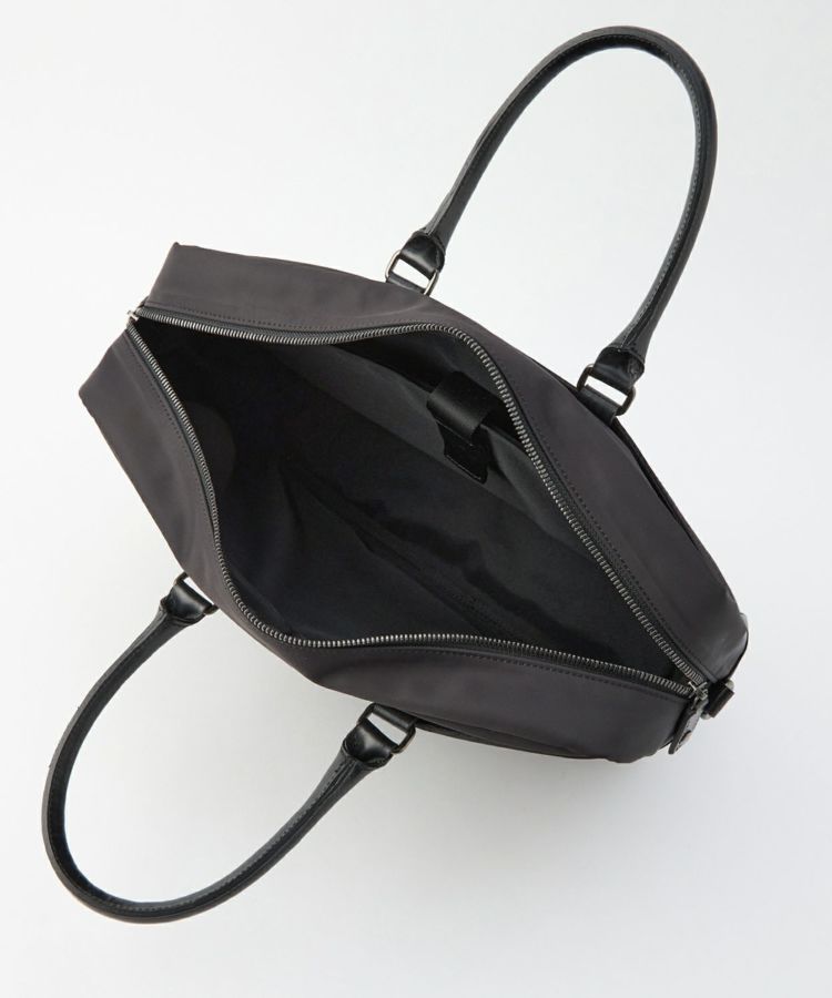 持ち物が多い時にも扱いやすいサイズ感。取り外し可能なショルダーストラップ付きで、2WAYで使用可能です。メインポケットの全面に保護パッドが入っているため、パソコンなども安心して持ち運べます。素材は程よい光沢があるナイロンツイル(撥水加工)を用い、ポケット口部分などにブライドルレザーをあしらうことで品の良さを演出。シンプルながらも高級感のあるアイテムです。