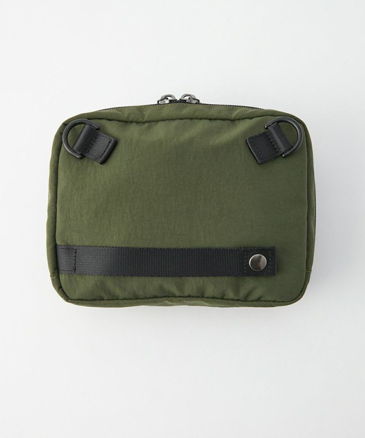 ショルダーストラップは取り外し可能で、ポーチとして2WAYで使用可能です。内側の両サイドにマチを作り、開きやすさも確保。ポケットが設置されており、小さい物を収納することができます。フロントポケットはスナップが2段階で留めることでき、背面のスナップテープで大きい鞄などに止めつけることも可能です。ナイロン生地にはアクリルをベースとしたバッグコーティング剤(広塗布用)を塗布し、優れたハリ感と撥水機能を持たせました。シーズン問わずお使いいただけるアイテムです。