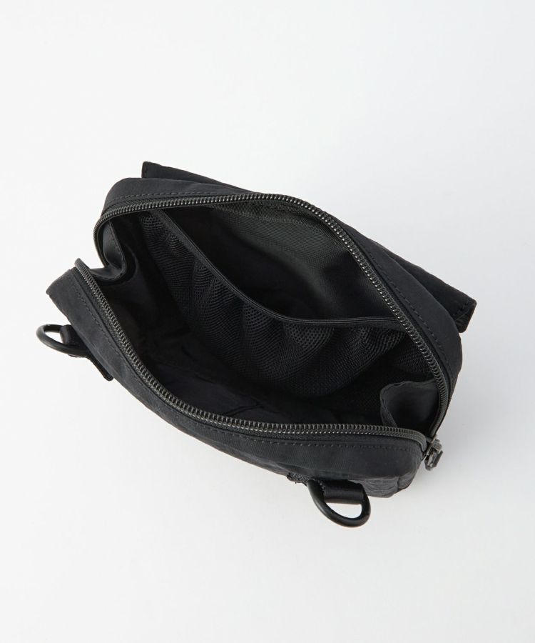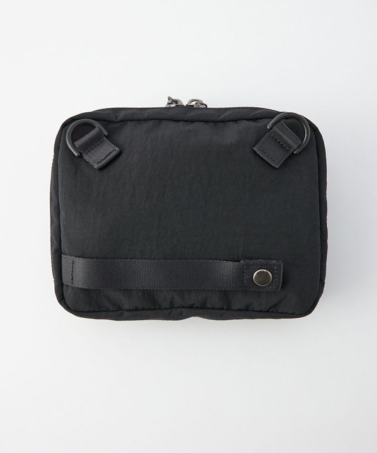 ショルダーストラップは取り外し可能で、ポーチとして2WAYで使用可能です。内側の両サイドにマチを作り、開きやすさも確保。ポケットが設置されており、小さい物を収納することができます。フロントポケットはスナップが2段階で留めることでき、背面のスナップテープで大きい鞄などに止めつけることも可能です。ナイロン生地にはアクリルをベースとしたバッグコーティング剤(広塗布用)を塗布し、優れたハリ感と撥水機能を持たせました。シーズン問わずお使いいただけるアイテムです。