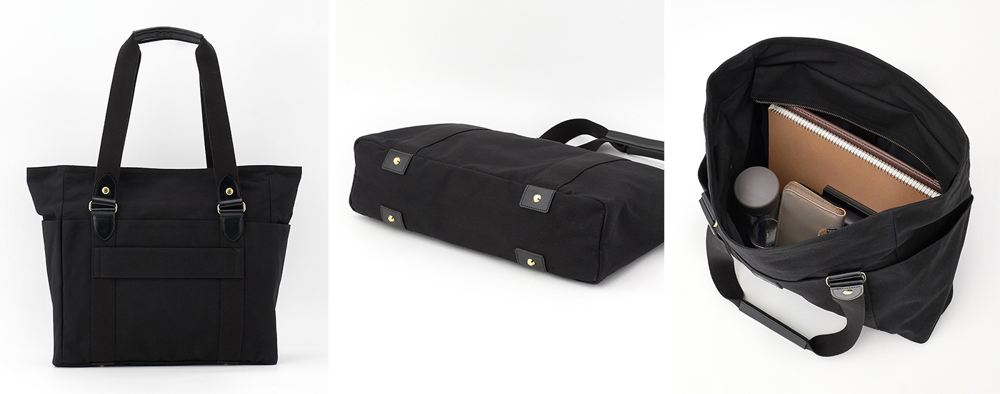 13inch程度のラップトップが収納可能なファスナー開きのトートバッグ。