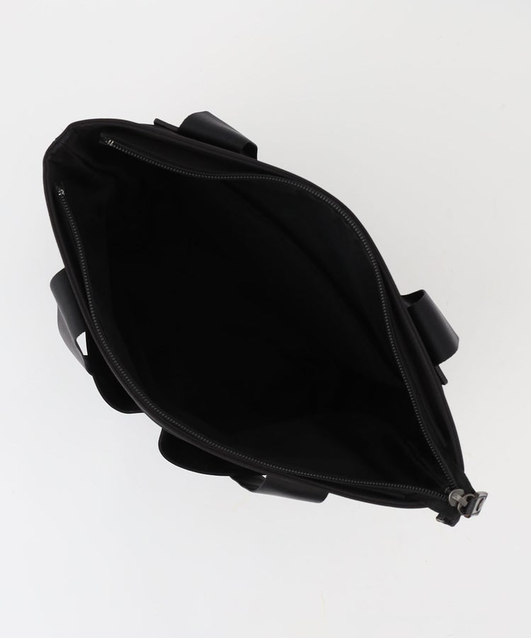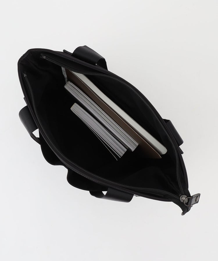 また、内側には13inch程度のPCが収納できるパッド入り内ポケットが付いています。バッグ口はファスナー仕様で、中身が見えないようになっています。大きめのハンドルパッジにはブライドルレザーを使用し、絶妙なアクセントに。