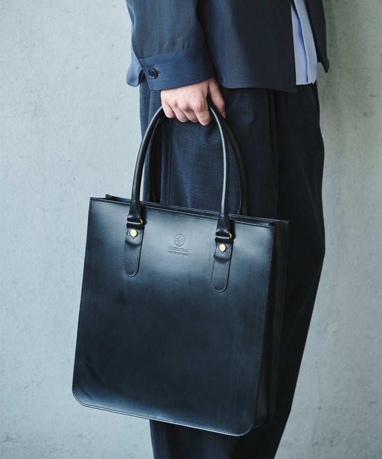 A4サイズの書類がゆとりを持って入る縦長式のレザートートバッグ。