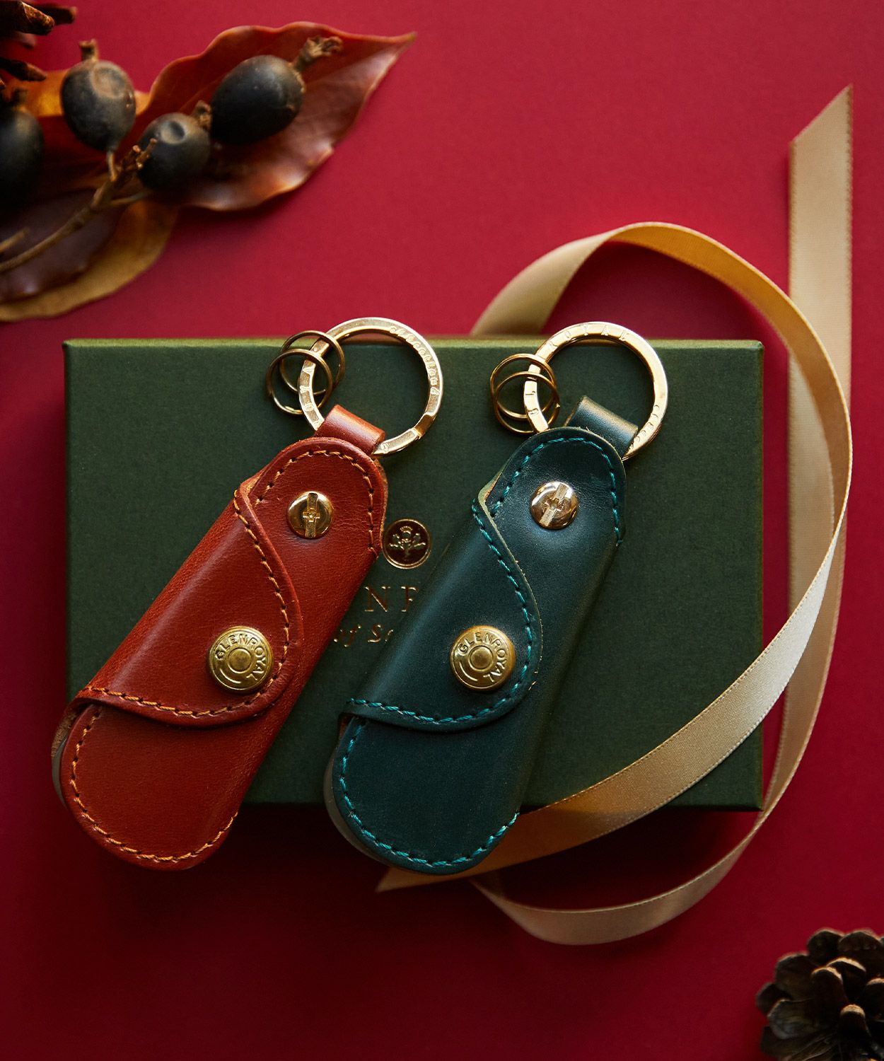 ・煌めくスナップボタンとレザーの曲線的なカッティングが武骨なイメージを軽減。モダンなスタイルやバッグに違和感なく馴染むので、男女問わずプレゼントとしても最適。逆にステッチ部分はレザーと同色にすることでカジュアルになりすぎず、ドレスシーンにもマッチするバランスで仕上がっています。(左下)