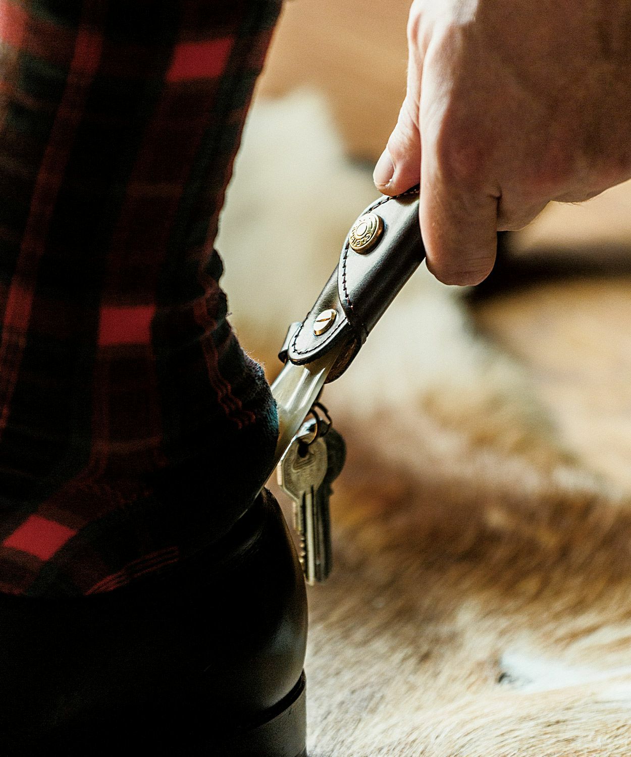 グレンロイヤルのポケットシューホーンは、何といっても手のひらに収まるコンパクトなサイズが魅力。どんな場所でも気軽に持ち歩く事が可能です。本体は水牛の角を採用しており、職人の手によってひとつひとつ丁寧に削って磨かれ、非常に滑らかな仕上がり。靴と踵の間にスルリと入り、靴を傷めることなくスムーズに履くことができます。シューホーンを覆うカバーは、グレンロイヤルのアイコンでもあるブライドルレザー。スナップボタンが付いているので、ホーンが飛び出てくる心配もありません。