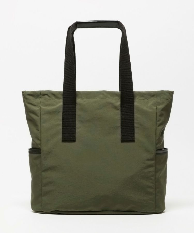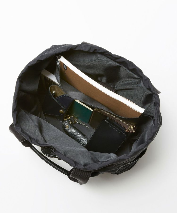 A4サイズの書類が余裕を持って入る大きさです。フロントに大きめのファスナーポケットがあり、ドローコードを引けば中身が見えない仕様など、デザインと機能性の両方を兼ね備えています。内ポケットが付いており、細々したものの収納が可能。ファスナー引手とぶたばなにはブライドルレザーを使用し高級感をプラス。容量は充分にありますが、軽量なためタウンユースからレジャーなど幅広くお使いいただけます。ナイロン生地にはアクリルをベースとしたバッグコーティング剤(広塗布用)を塗布し、優れたハリ感と撥水機能を持たせました。ブライドルレザーと撥水ナイロンを組み合わせシーズン問わずお使いいただけるアイテムです。
