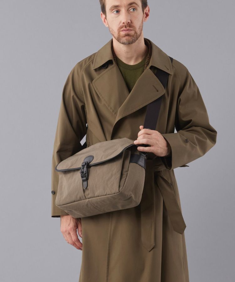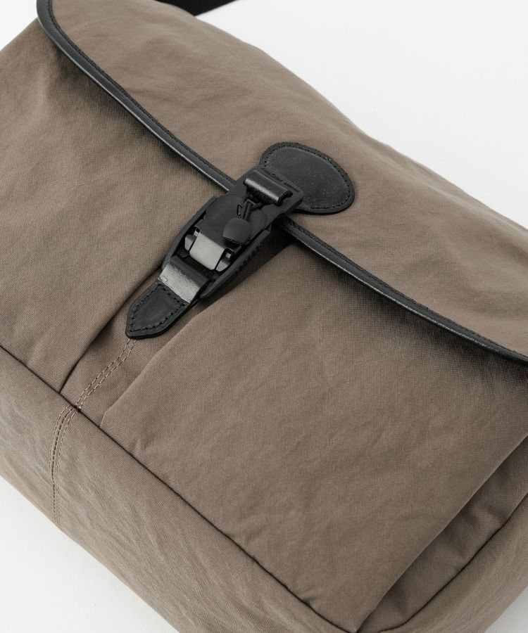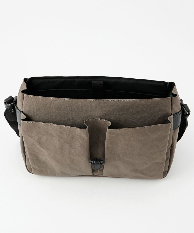 塩縮加工を施した生地密度が高いナイロンを採用したことで、強度がありながらも軽い使い心地のショルダーバッグです。タスラン加工糸を使用しコットンライクな仕上がりですが、撥水性を備えているところもポイント。フラップ裏には細々したものをわけて収納できるファスナーポケットがあり、普段使いにもぴったりです。