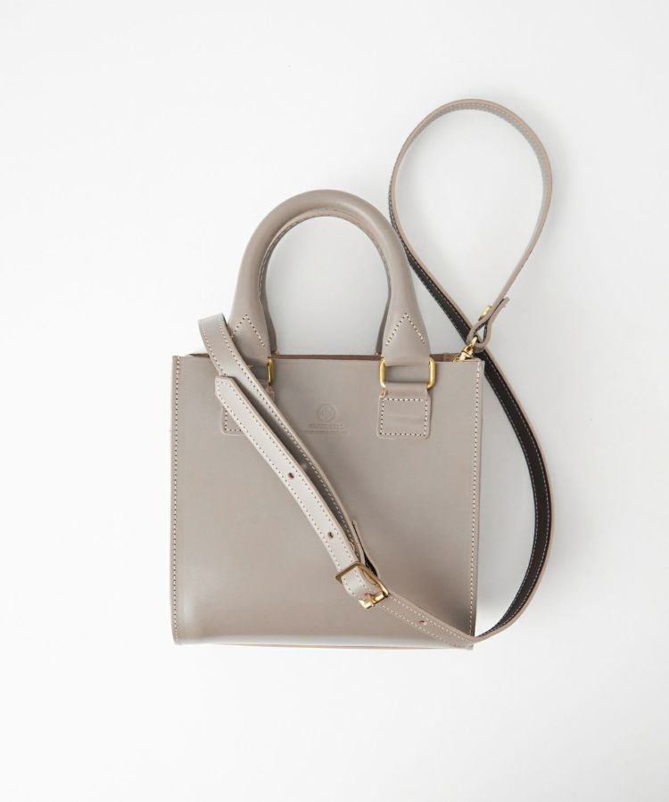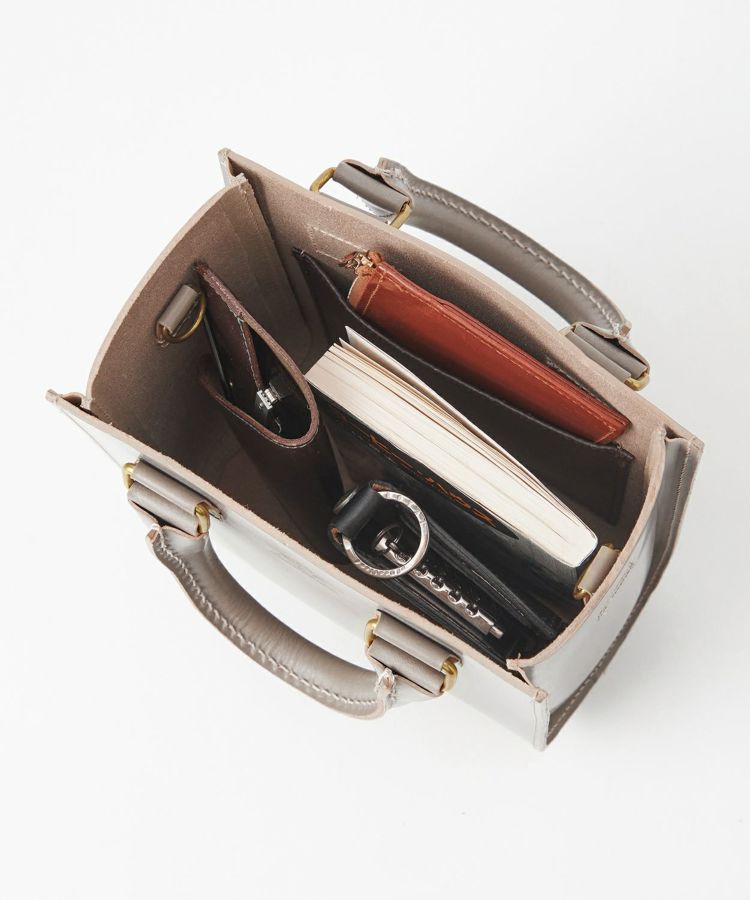 取り外し可能なショルダーストラップ付きで2WAY使用可能です。見た目は小さく見えますが350mlのペットボトル、財布、ポーチが入るくらい、充分に容量があります。シンプルで上品な見た目で、オンオフ問わず幅広いシーンでお使いいただけます。ハンドル部分が角カンで倒れるため、保管しやすいところも嬉しいポイントです。