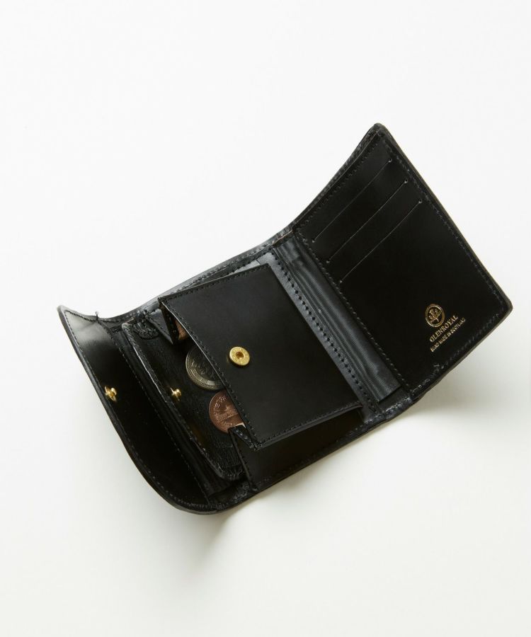 バッグの中で財布が開くのを防いでくれる、フラップ付きの三つ折り財布。