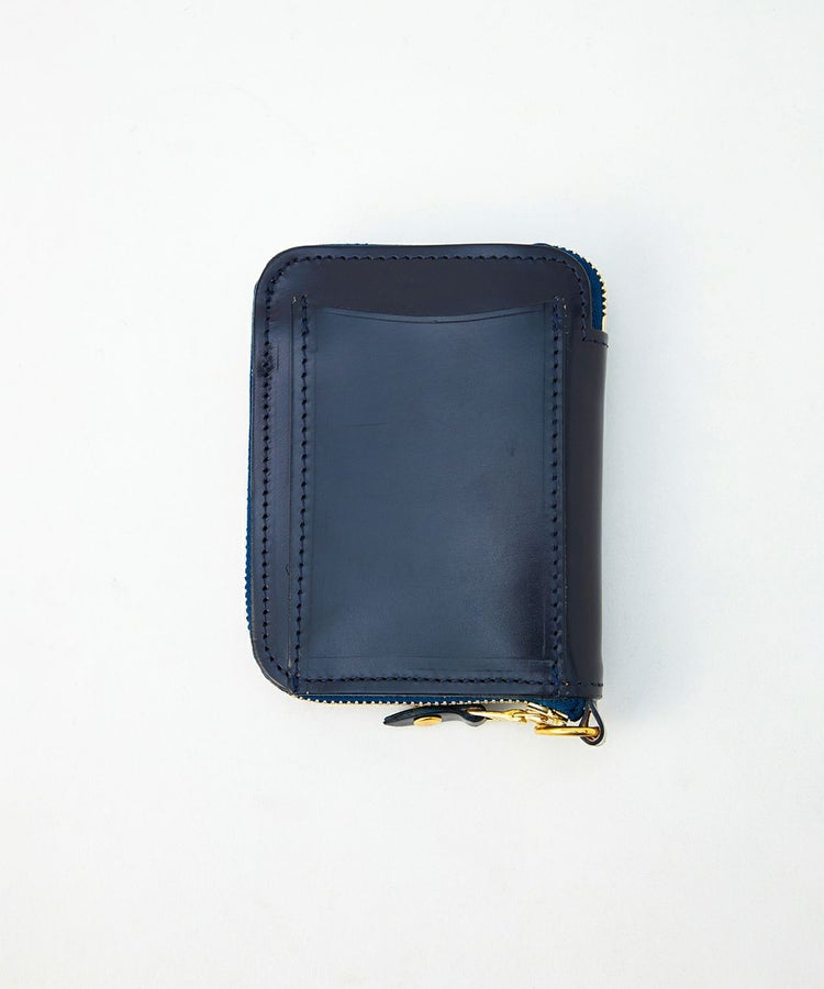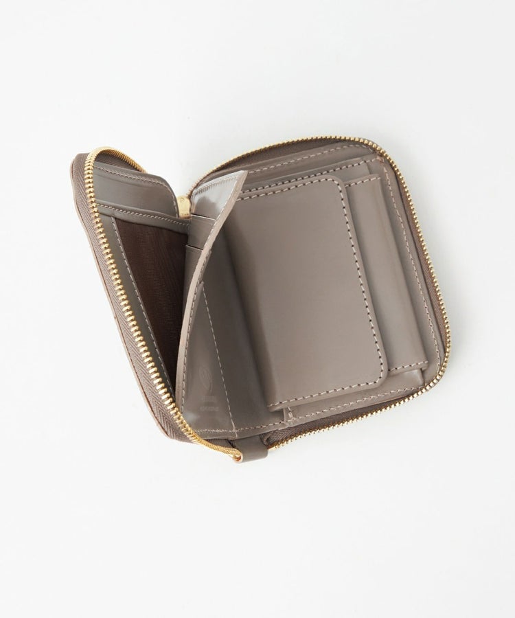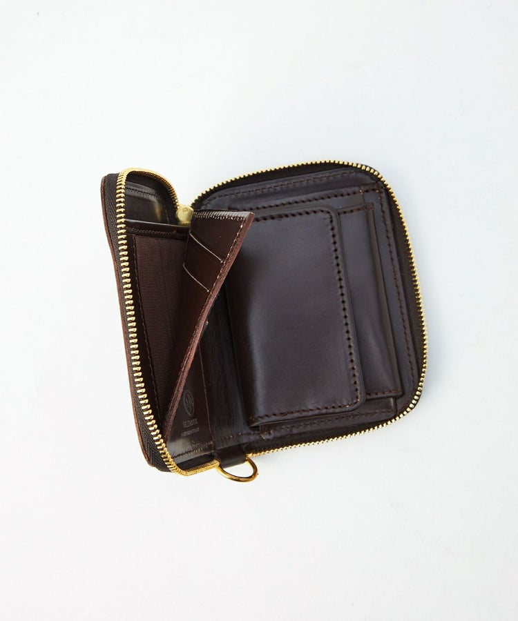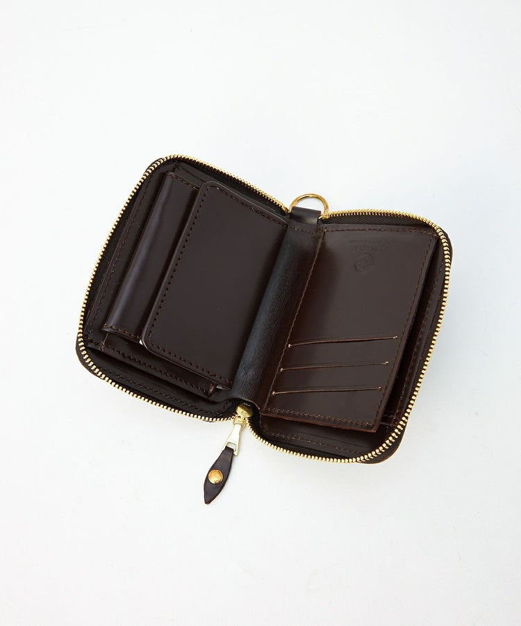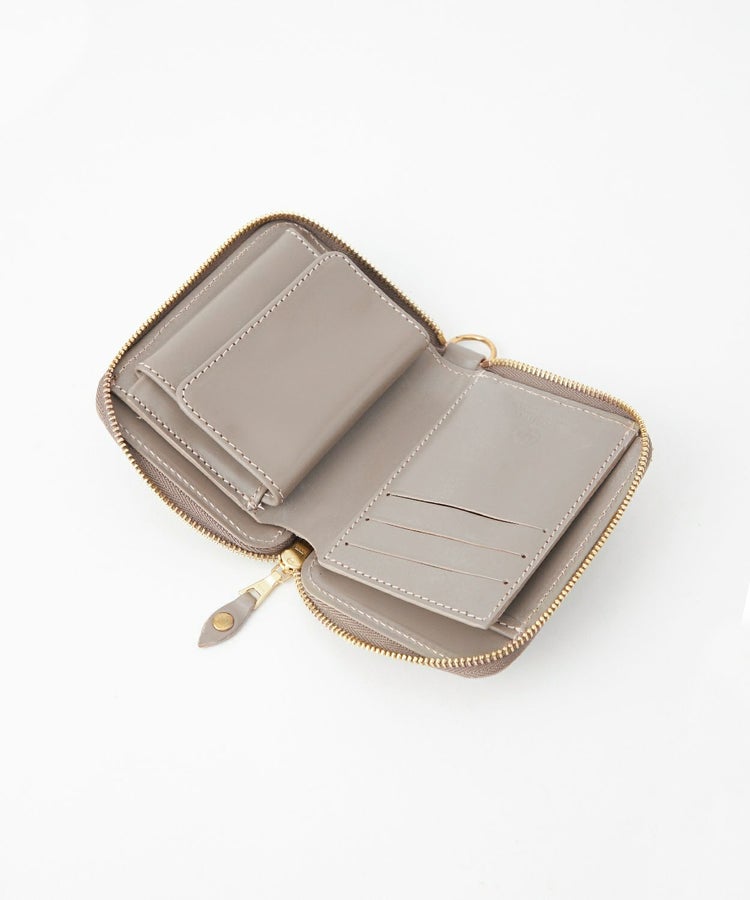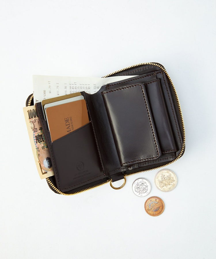 クレジットカードほどのサイズ感で、財布を開くと内側にはカード収納やマチ付きのコインケース、さらには仕切り付きの札入れがあるため、見た目以上に充実した収納力を備えています。背面外側にもカードポケットがあることで使用頻度が高いICカードなどを収納でき、財布を開かなくてもカードの出し入れが可能です。ウォレットコードやタッセル、キーホルダーなどを付けることができるDリングを搭載しているので、独自のアレンジもお勧めです。
