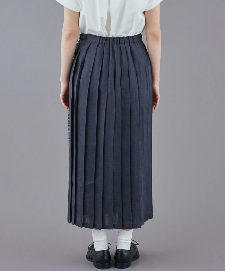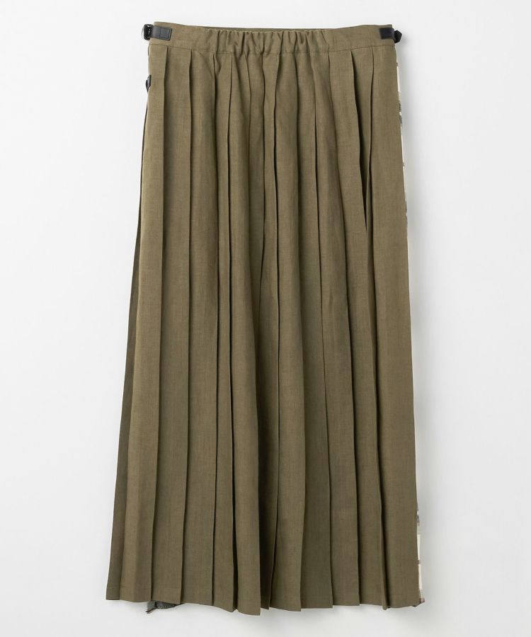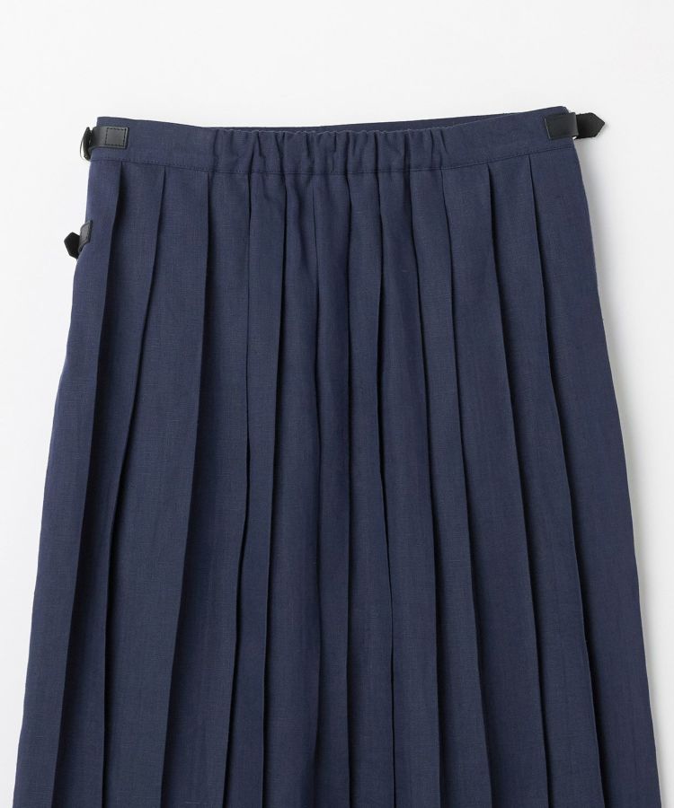 軽やかで涼しげなリネン素材をベースに、フロントパネルデザインはフリンジがアクセント。歩くたびに揺れるバックプリーツとタックインした時アクセントになるウエストベルト、サイドに施された3つのレザーベルトがコーディネートを引き締めます。バックウエストにはゴムが施されているためストレスフリーな着心地。シンプルなトップスを合わせることで、キルトスカートの魅力がより引き立ちます。