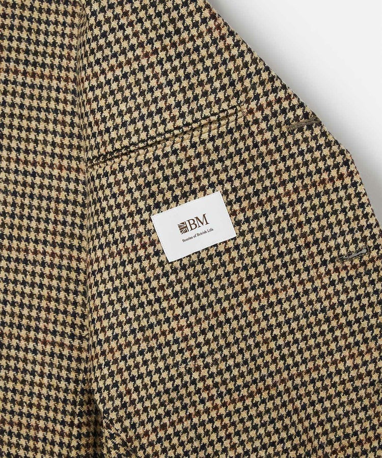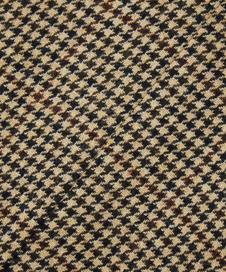 150年の歴史を誇る英国老舗高級生地ブランド、マラリウス社によるガンクラブチェックのツイードを使用。ウール100%で、目付は330g/mのライトウェイトツイードに仕上げられています。