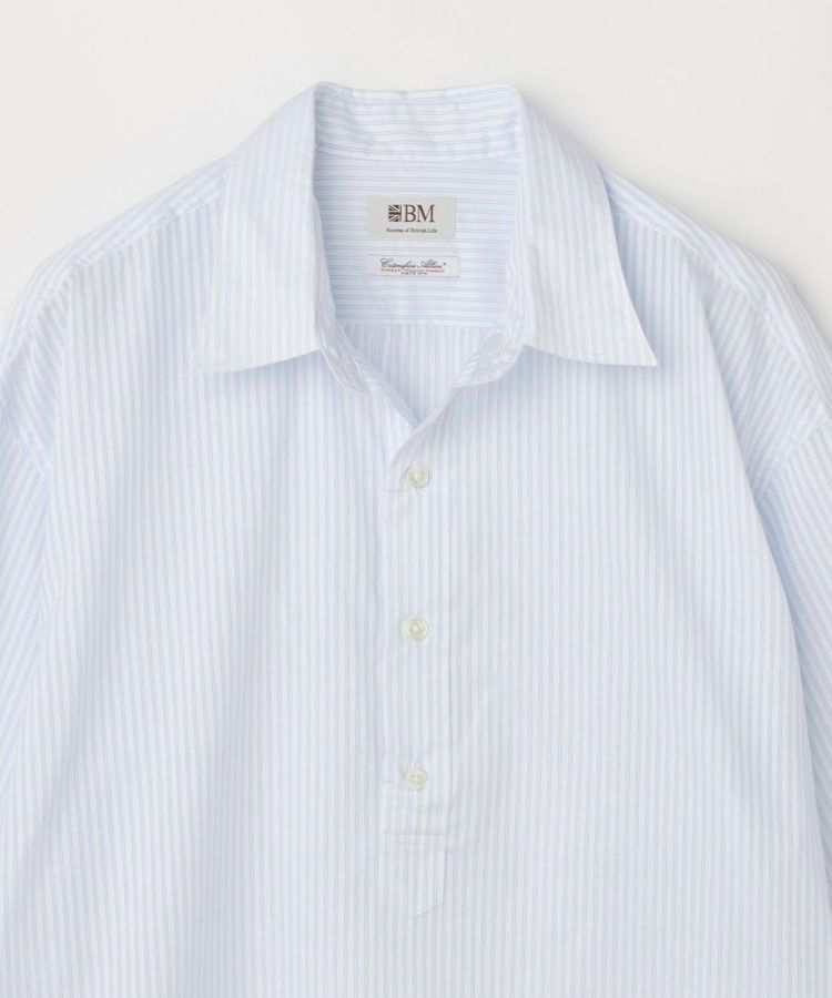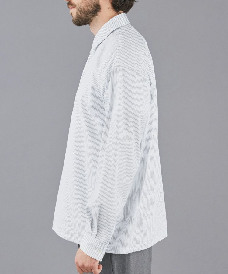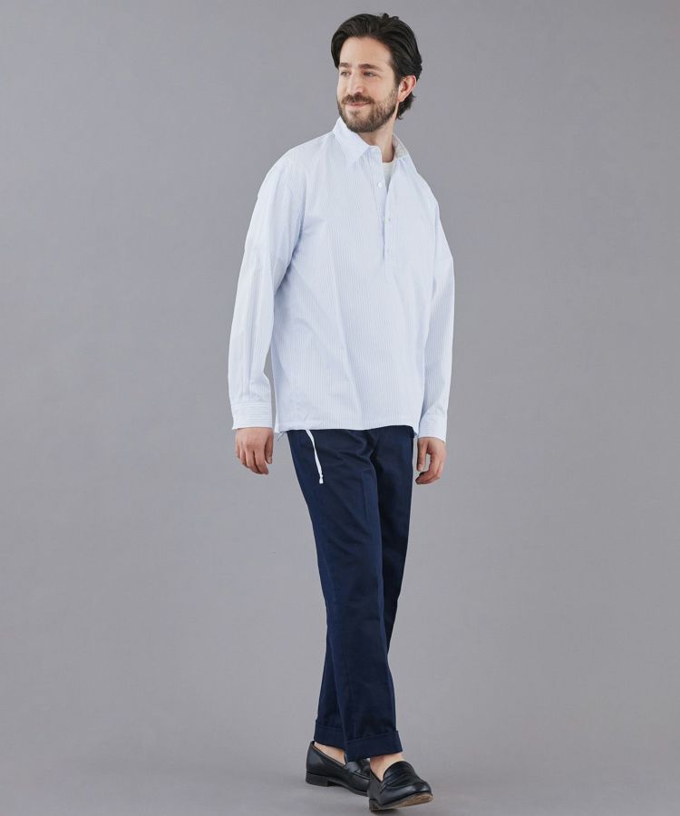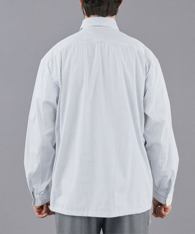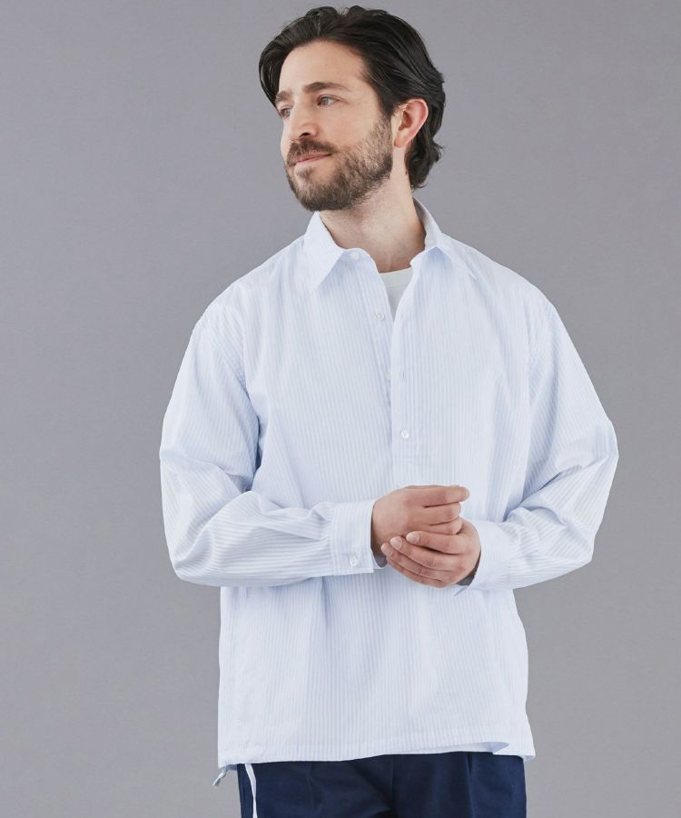イタリアのカプリシャツのイギリス版をイメージし、カジュアルシーンで夏にサラッとラフに羽織れて大人らしい品のあるシャツを開発。襟のインカーブや柔らかい芯地のレギュラーカラーなどドレスシャツ/ロンドンとも通じる仕様。生地とカフスがある点はシャツ要素ですが、共地の紐を使い裾がブラウジングでき、タックアウトした時はブルゾンのようなシルエットに。またタックインのバランスを考慮した作りになっておりTPOに併せた装いが可能です。