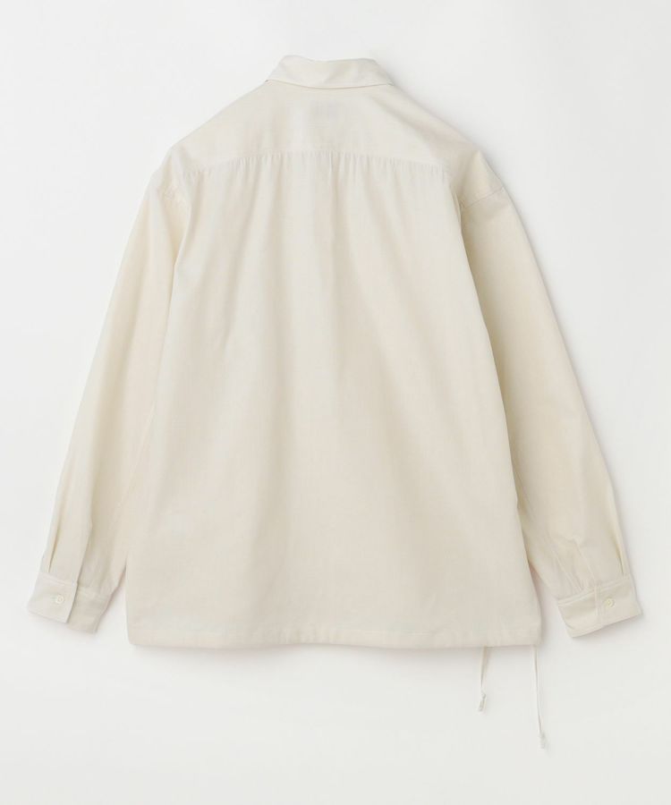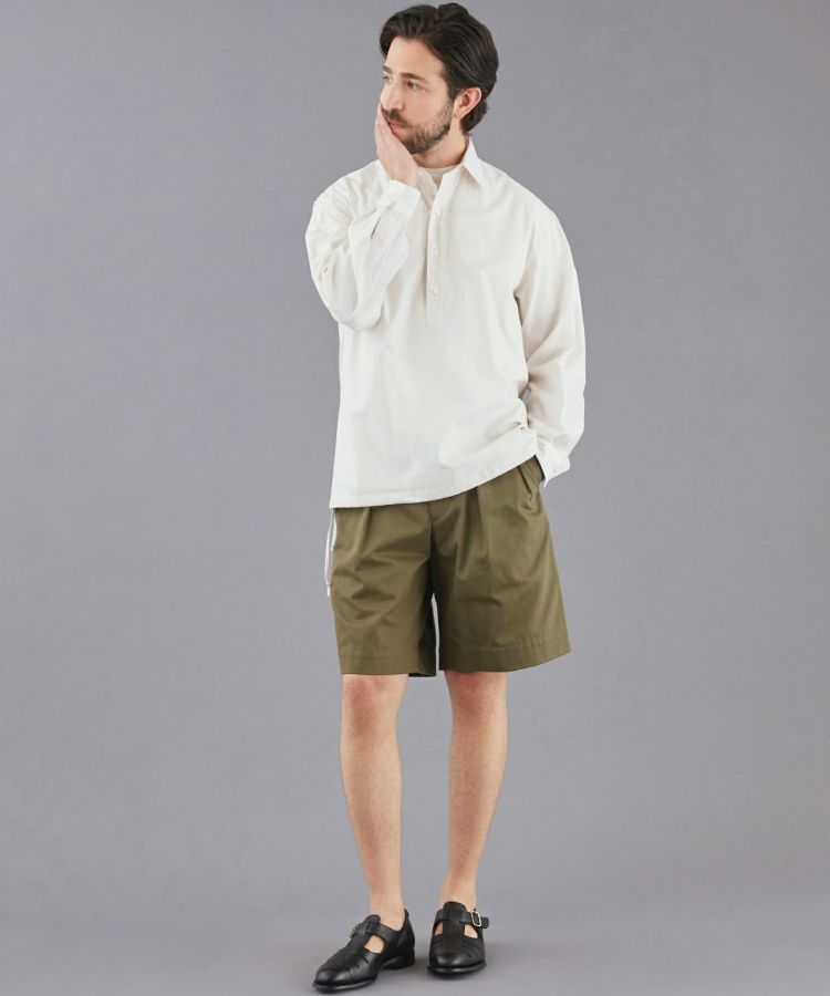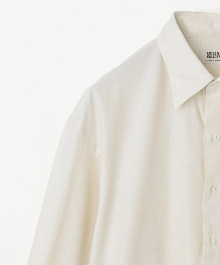 イタリアのカプリシャツのイギリス版をイメージし、カジュアルシーンで夏にサラッとラフに羽織れて大人らしい品のあるシャツを開発。襟のインカーブや柔らかい芯地のレギュラーカラーなどドレスシャツ/ロンドンとも通じる仕様。生地とカフスがある点はシャツ要素ですが、共地の紐を使い裾がブラウジングでき、タックアウトした時はブルゾンのようなシルエットに。またタックインのバランスを考慮した作りになっておりTPOに併せた装いが可能です。