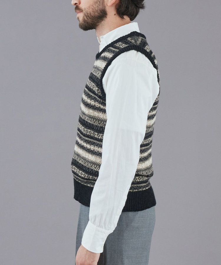 スコットランド発祥のクラシックなパターン、フェアアイルを取り入れた、英国らしいカントリースタイルのニットベストです。