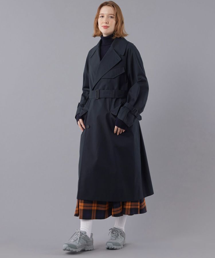 襟はエレガントにカッティングし、冬の寒い日には襟を立て、チンタブを使うことでマフラーを使わなくても防寒が可能。またチンタブで襟を止めるとより一層渋さが増します。また裾に向けてなだらかに広がるAラインシルエットも魅力のひとつ。絶妙なオーバーサイズバランスが、スタイルをよく見せる効果も。
