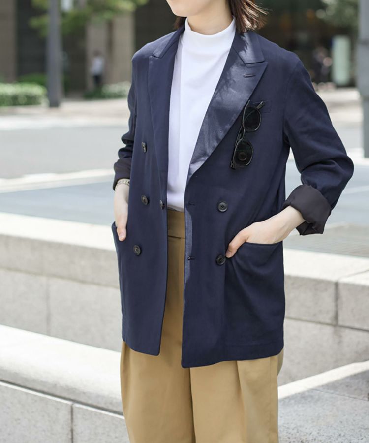 下襟が上向きに尖った「ピークドラペル」はフォーマルなディテールで、ラフな着こなしでも品を漂わせてくれます。シルエットは現代的に着こなせるよう大きくシェイプさせずに、ボクシーでメンズライクなスタイルに再構築。やや“ON”な印象を楽しみたい場合にはアイロンをかけてパンツとセットアップで着てもよし、カジュアルに着たい場合はカーディガン感覚でTシャツ、デニムのスタイルに羽織ってもよし。幅広いテイストのスタイリングに対応し、着回し力にも優れています。