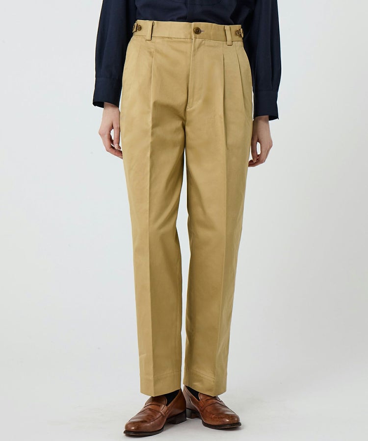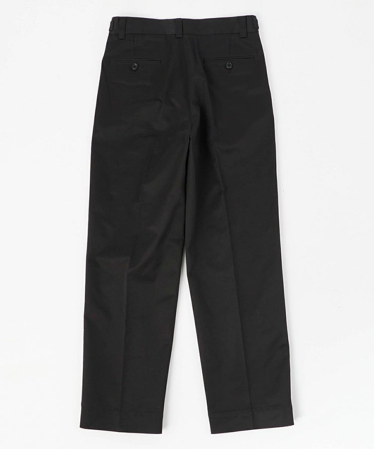 ウエストはサイドベルトでアジャストが可能。程よい光沢感があり、実用性に優れた素材はオンオフ問わずご利用いただけます。程よく太めのストレートシルエットは裾をロールアップしてソックス見せコーデもおすすめです。