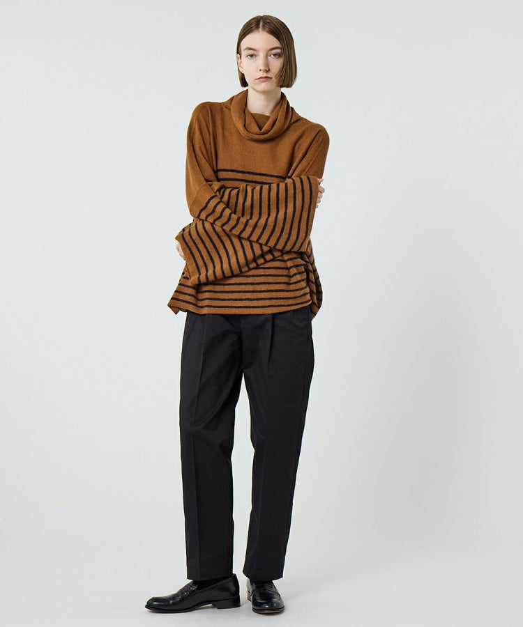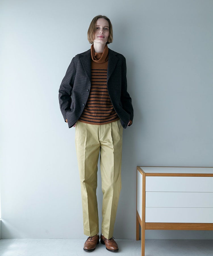 すっきりとしたラインが魅力のチノパンは、股上が深めで足長効果があり、穿くだけで脚をまっすぐ、きれいに演出。柔らかく上品なベージュと、着回し力抜群のブラックの2色をご用意。カジュアルからきれいめまで幅広く活躍する、頼れる一本です。