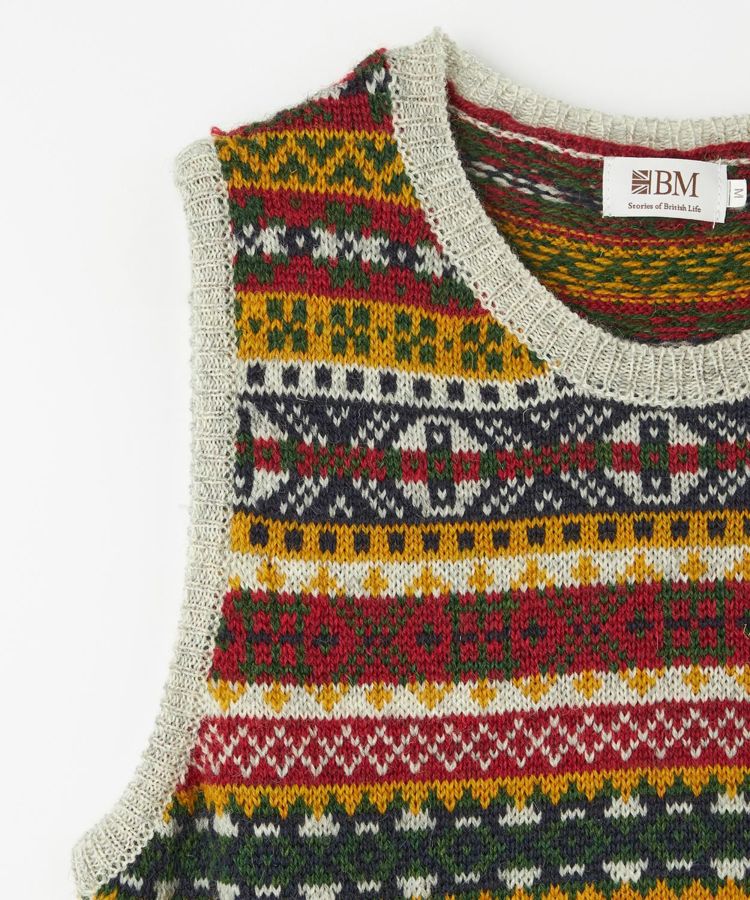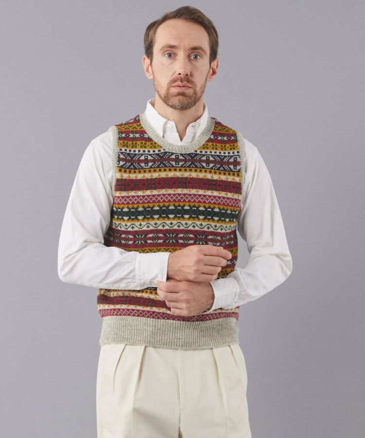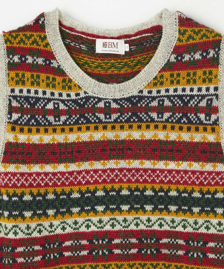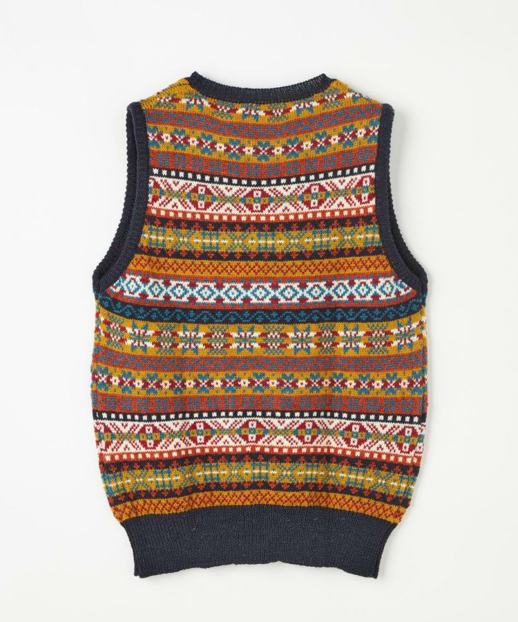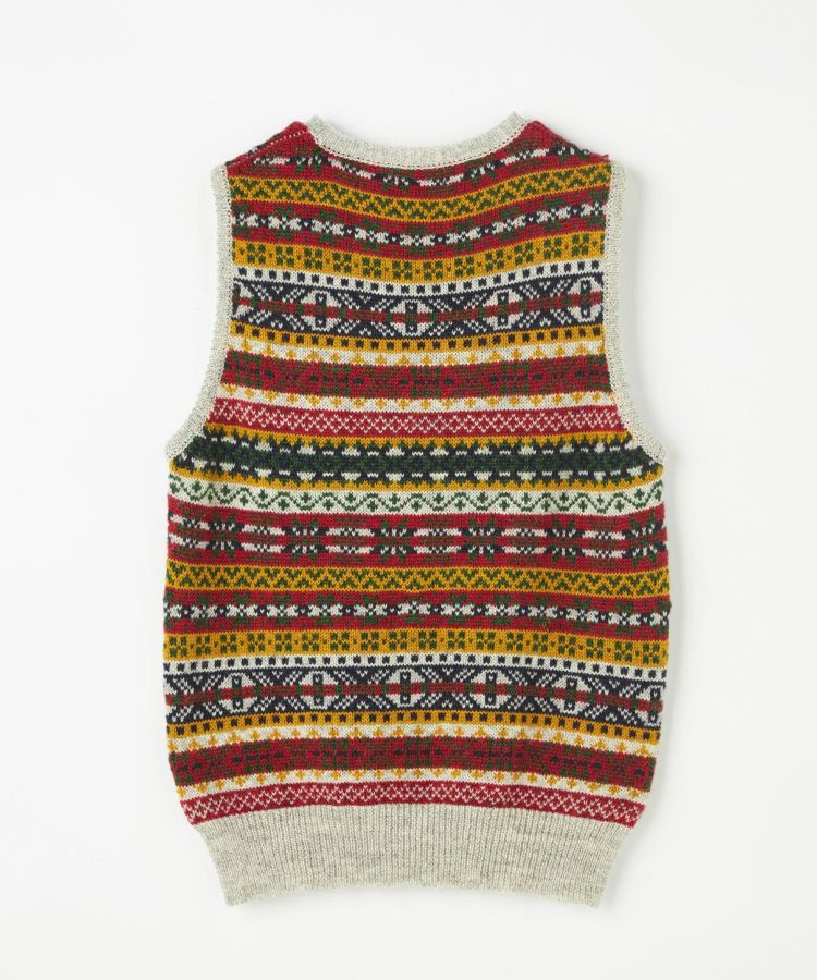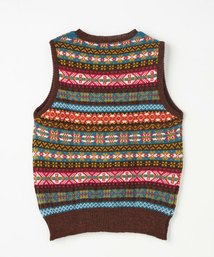 スコットランド発祥のクラシカルなパターンであるフェアアイルを取り入れた、英国らしいカントリースタイルのニットベスト。