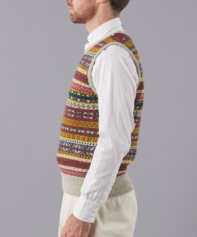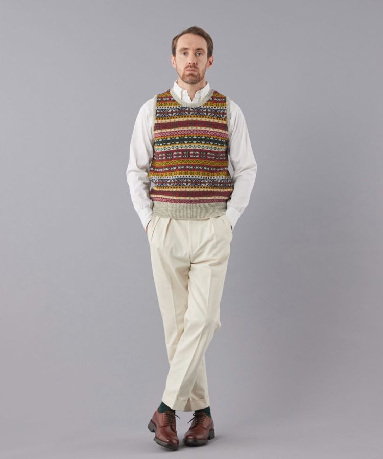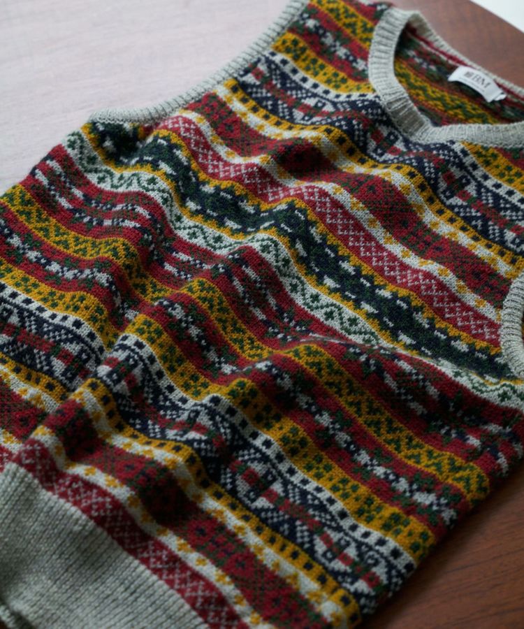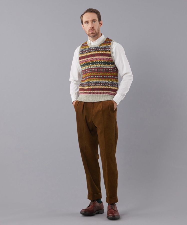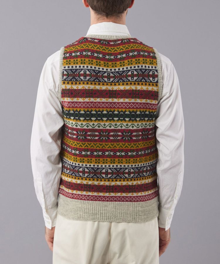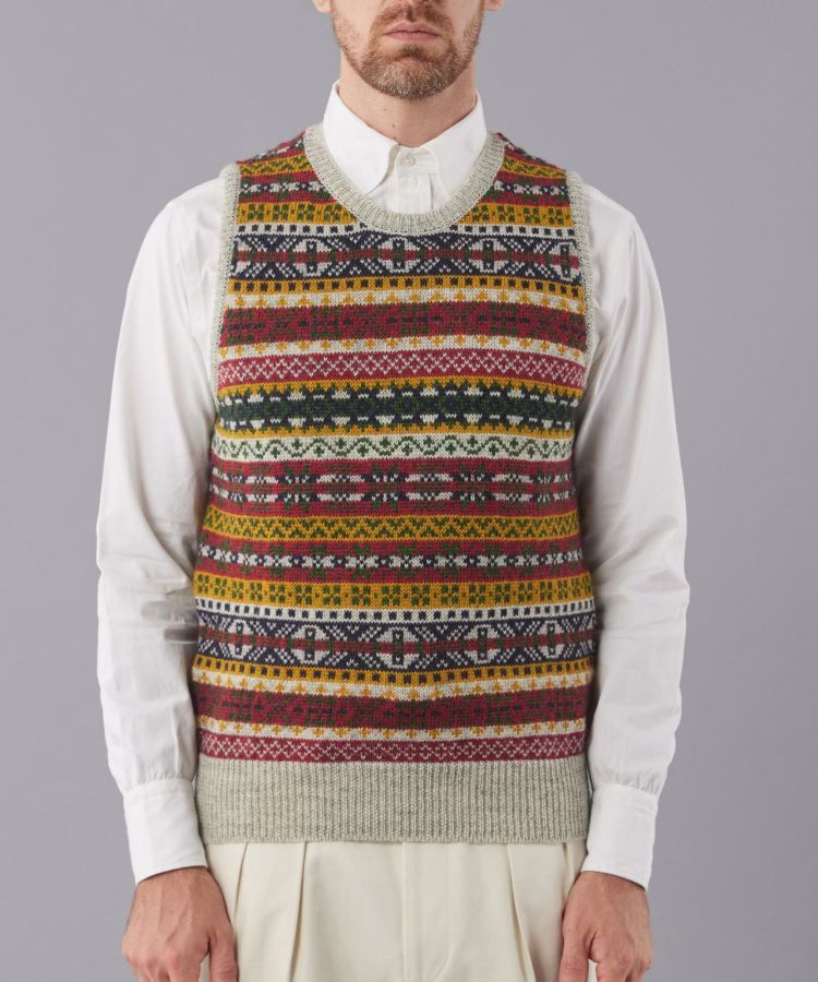 スコットランド発祥のクラシカルなパターンであるフェアアイルを取り入れた、英国らしいカントリースタイルのニットベスト。