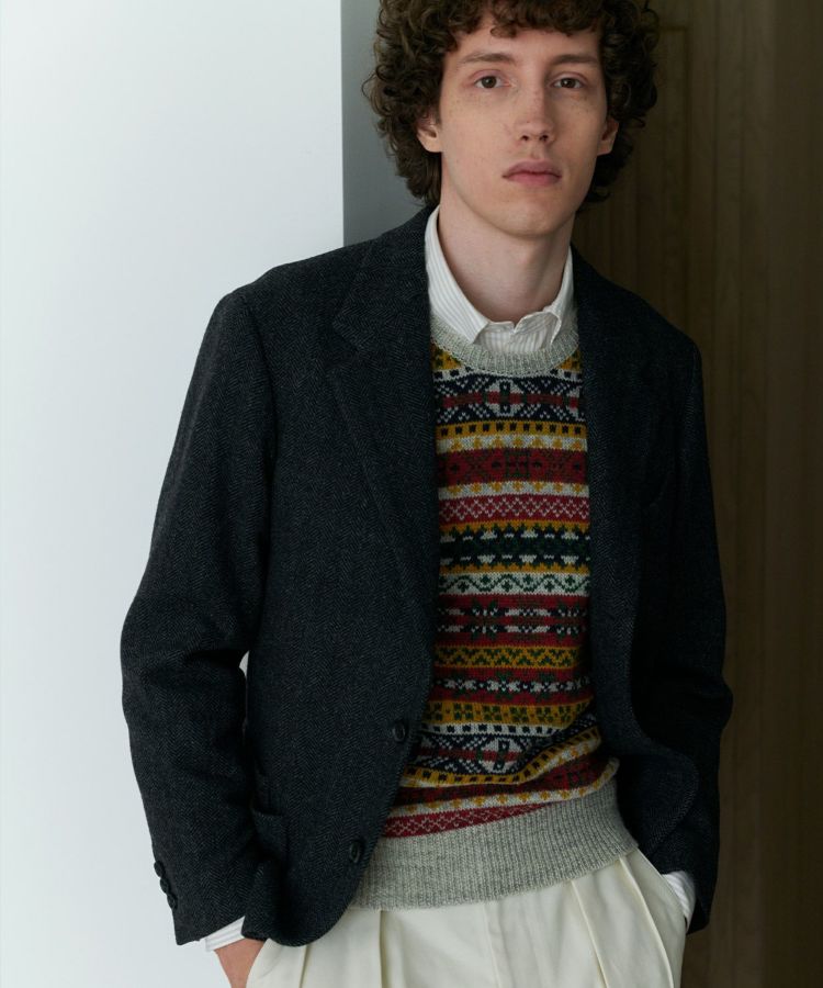 英国で育った羊から採れたBRITISH WOOLを贅沢に用いて、紡績から生産に至るまで、すべて英国国内で完結させたこだわりの一枚。本来ごわつきの残る特徴がある糸ですが、丁寧なハンドフレームで紡がることで柔らかな仕上がりに、手作業ならではの温かみのある印象もを感じさせる上品な一着となっております。